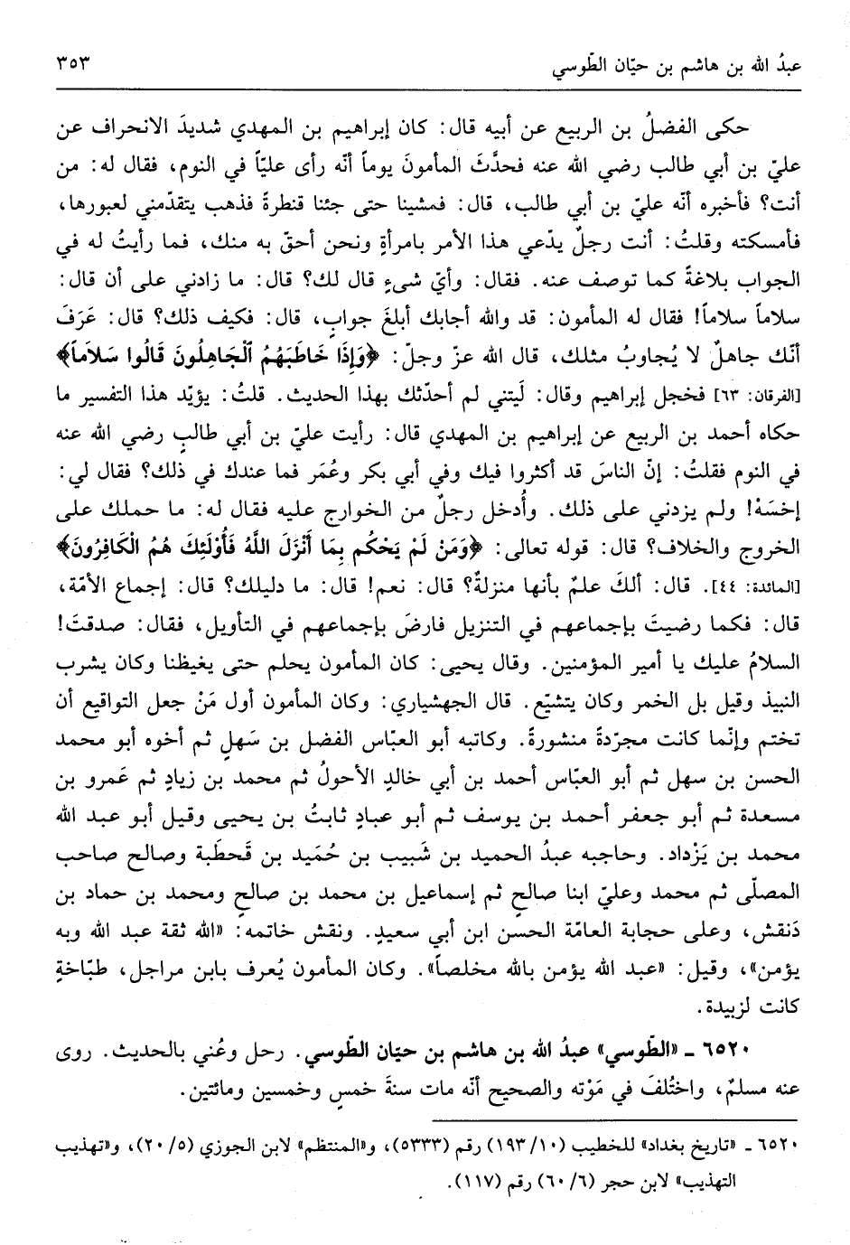أَنْت رجلٌ يَدعِي هَذَا الْأَمر بامرأةٍ وَنحن أَحَق بِهِ مِنْك فَمَا رَأَيْت لَهُ فِي الْجَواب بلاغةً كَمَا تُوصَف عَنهُ فَقَالَ واي شَيْء قَالَ لَك قَالَ مَا زادني على أَن قَالَ سَلاما سَلاما فَقَالَ لَهُ الْمَأْمُون قد وَالله أجابك أبلغ جوابٍ قَالَ فَكيف ذَلِك قَالَ عرف أَنَّك جاهلٌ لَا يُجَاوب مثلك قَالَ الله عز وَجل وَإِذا خاطبهم الجاهلون قَالُوا سَلاما فَخَجِلَ إِبْرَاهِيم وَقَالَ لَيْتَني لم أحَدثك بِهَذَا الحَدِيث قلتُ يُؤَيّد هَذ التَّفْسِير مَا حَكَاهُ أَحْمد بن الرّبيع عَن إِبْرَاهِيم ابْن الْمهْدي قَالَ رَأَيْت عَليّ بن أبي طَالب رَضِي الله عَنهُ فِي النّوم فَقلت إِن النَّاس قد أَكْثرُوا فِيك وَفِي أبي وَعمر فَمَا عنْدك ذَلِك فَقَالَ لي إخسه وَلم يزدني على ذَلِك وَأدْخل رجلٌ من الْخَوَارِج عَلَيْهِ فَقَالَ لَهُ مَا حملك على الْخُرُوج وَالْخلاف قَالَ قَوْله تَعَالَى وَمن لم يحكم بِمَا أنزل الله فَأُولَئِك هم الْكَافِرُونَ قَالَ أَلَك علمٌ بِأَنَّهَا منزلةٌ قَالَ نعم قَالَ مَا دليلك قَالَ إِجْمَاع الْأمة قَالَ فَكَمَا رضيت بإجماعهم فِي التَّنْزِيل فارض بإجماعهم فِي التَّأْوِيل فَقَالَ صدقت السَّلَام عَلَيْك يَا أَمِير الْمُؤمنِينَ وَقَالَ يحيى كَانَ الْمَأْمُون يحلم حَتَّى يغيظنا وَكَانَ يشرب النَّبِيذ وَقيل بل الْخمر وَكَانَ يتشيع قَالَ الجهشياري وَكَانَ الْمَأْمُون أول من جعل التواقيع أَن تختم وَإِنَّمَا كَانَت مُجَرّدَة منشورةً وكاتبه أَبُو الْعَبَّاس الْفضل بن سهلٍ ثمَّ أَخُوهُ أَبُو مُحَمَّد الْحسن بن سهل ثمَّ أَبُو الْعَبَّاس أَحْمد بن أبي خالدٍ الْأَحول ثمَّ مُحَمَّد بن زيادٍ ثمَّ عَمْرو ابْن مسْعدَة ثمَّ أَبُو جَعْفَر أَحْمد بن يُوسُف ثمَّ أَبُو عبادٍ ثَابت بن يحيى وَقيل أَبُو عبد الله مُحَمَّد بن يزْدَاد وحاجبه عبد الحميد بن شبيب بن حميد بن قَحْطَبَةَ وَصَالح صَاحب الْمصلى ثمَّ مُحَمَّد وَعلي ابْنا صالحٍ ثمَّ إِسْمَاعِيل بن مُحَمَّد بن صالحٍ وَمُحَمّد بن حَمَّاد بن دنقش وعَلى حجابة الْعَامَّة الْحسن ابْن أبي سعيدٍ وَنقش خَاتمه الله ثِقَة عبد الله وَبِه يُؤمن وَقيل عبد الله يُؤمن بِاللَّه مخلصاً وَكَانَ الْمَأْمُون يعرف بِابْن مراجل طباخةٍ كَانَت لزبيدة
