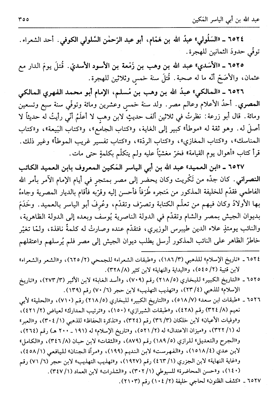 الْمَالِكِي عبد الله بن وهب بن مُسلم الإِمَام أَبُو مُحَمَّد الفِهري الْمَالِكِي الْمصْرِيّ أحد الْأَعْلَام وعالم مصر ولد سنة خمسٍ وَعشْرين وَمِائَة وَتُوفِّي سنة سبع وَتِسْعين وَمِائَة قَالَ أَبُو زرْعَة نظرت فِي ثَلَاثِينَ ألف حَدِيث لِابْنِ وهب لَا أعلم أَنِّي رَأَيْت لَهُ حَدِيثا وَلَا أصل لَهُ وَهُوَ ثِقَة لَهُ موطأ كَبِير إِلى الْغَايَة وَكتاب الْجَامِع وَكتاب الْبيعَة وَكتاب الْمَنَاسِك وَكتاب الْمَغَازِي وَكتاب الرِّدَّة وَكتاب تَفْسِير غَرِيب الْمُوَطَّأ وَغير ذَلِك قَرَأَ كتاب أهوال يَوْم الْقِيَامَة فَخر مغشياً عَلَيْهِ وَلم يتَكَلَّم بكلمةٍ حَتَّى مَاتَ