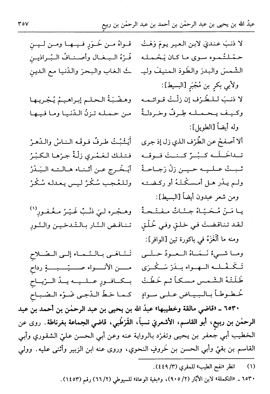 قَاضِي مالقة وخطيبها عبد الله بن يحيى بن عبد الرحمان بن أَحْمد بن عبد الرحمان بن ربيعٍ أَبُو الْقَاسِم الْأَشْعَرِيّ نسبا الْقُرْطُبِيّ قَاضِي الْجَمَاعَة بغرناطة روى عَن الْخَطِيب أبي جَعْفَر بن يحيى وَتفرد بالرواية عَنهُ وَعَن أبي الْحسن عَليّ القشوري وَأبي الْقَاسِم بن بَقِي وَأبي الْحسن بن خروف النَّحْوِيّ وروى عَنهُ ابْن الزبير وَأثْنى عَلَيْهِ وَولي