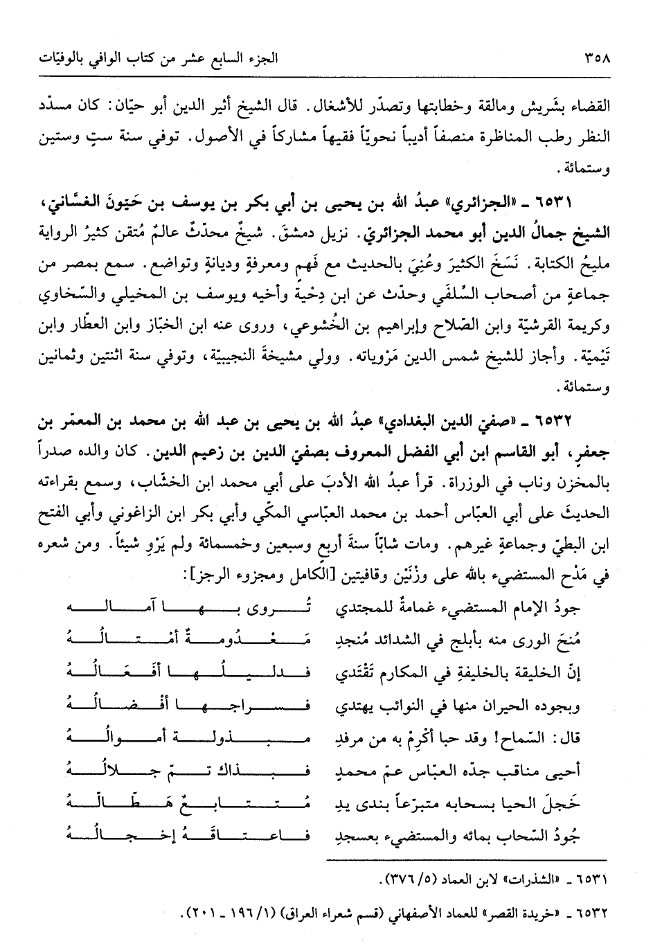 الْمَعْرُوف بصفي الدّين بن زعيم الدّين كَانَ وَالِده صَدرا بالمخزن وناب فِي الوزارة قَرَأَ عبد الله الْأَدَب على أبي مُحَمَّد ابْن الخشاب وَسمع بقرَاءَته الحَدِيث على أبي الْعَبَّاس أَحْمد ابْن مُحَمَّد العباسي الْمَكِّيّ وَأبي بكر ابْن الزغواني وَأبي الْفَتْح ابْن البطي وجماعةٍ وَغَيرهم وَمَات شَابًّا سنة أربعٍ وَسبعين وَخَمْسمِائة وَلم يرو شَيْئا وَمن شعره فِي مدح المستضيء بِاللَّه على وزنين وقافيتين من الْكَامِل ومجزوء الرجز
