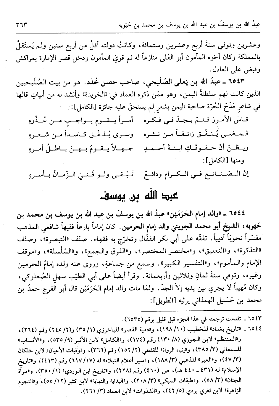 وَالِد إِمَام المحرمين عبد الله بن يُوسُف بن عبد الله بن يُوسُف بن مُحَمَّد بن حيويه الشَّيْخ أَبُو مُحَمَّد الْجُوَيْنِيّ وَالِد إِمَام الْحَرَمَيْنِ كَانَ إِمَامًا بارعاً فَقِيها شَافِعِيّ الْمَذْهَب مُفَسرًا نحوياً أديباً تفقه على أبي بكر الْقفال وَتخرج بِهِ فُقَهَاء صنف التَّبْصِرَة وصنف التَّذْكِرَة وَالتَّعْلِيق ومختصر الْمُخْتَصر وَالْفرق وَالْجمع والسلسلة وموقف الإِمَام وَالْمَأْمُوم وَالتَّفْسِير الْكَبِير وَسمع من جماعةٍ وروى عَنهُ وَلَده إِمَام الْحَرَمَيْنِ وَغَيره وَتُوفِّي سنة ثمانٍ وَثَلَاثِينَ وَأَرْبَعمِائَة وَقَرَأَ أَيْضا على أبي الطّيب سهلٍ الصعلوكي وَكَانَ مهيباً لَا يجْرِي بَين يَدَيْهِ إِلَّا الْجد وَلما مَاتَ وَالِد إِمَام الْحَرَمَيْنِ قَالَ أَبُو الْفرج حمد بن مُحَمَّد بن حسنيل الهمذاني يرثيه من الطَّوِيل