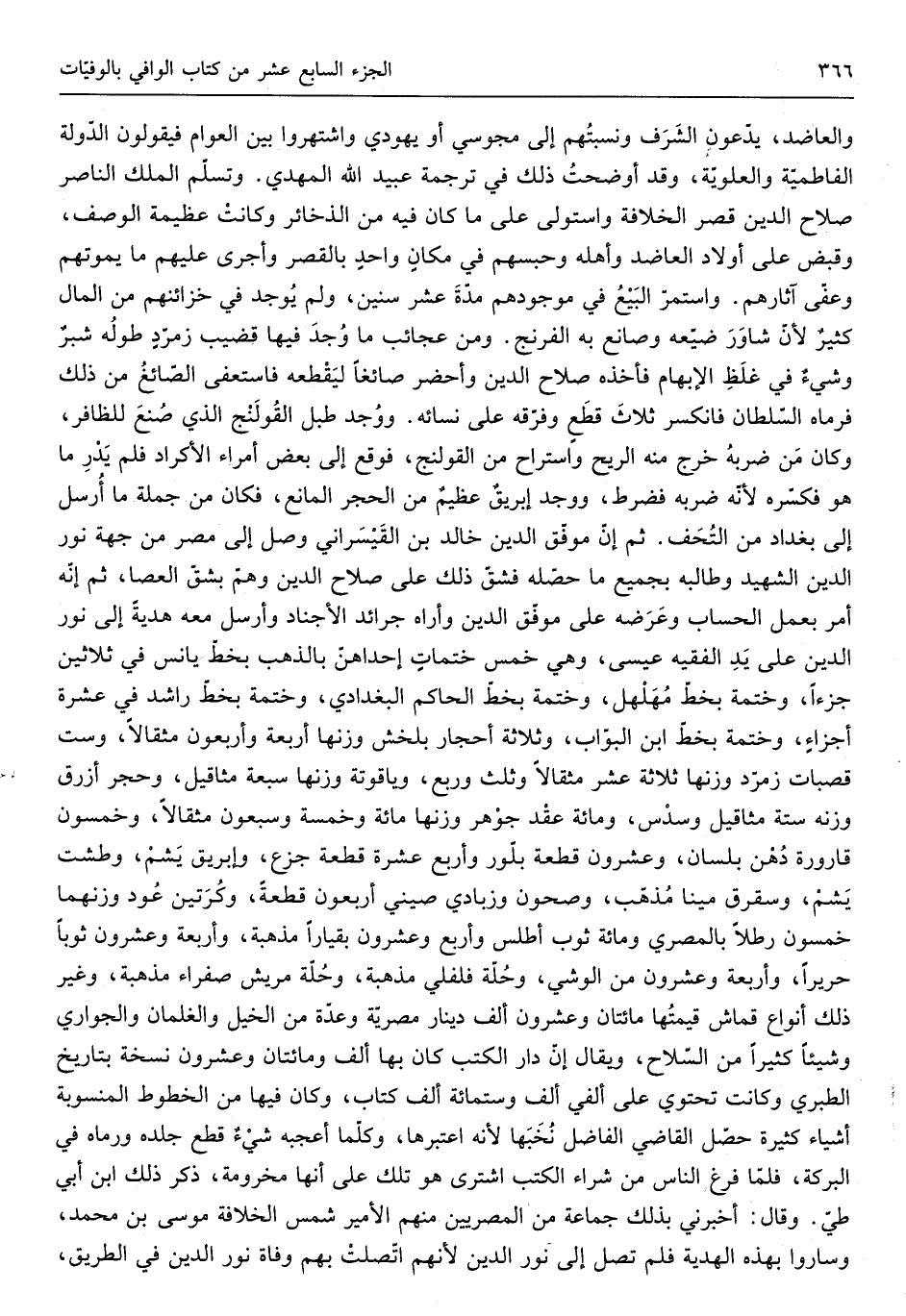 والعاضد يدعونَ الشّرف ونسبتهم إِلَى مَجُوسِيّ أَو يَهُودِيّ واشتهروا بَين الْعَوام فَيَقُولُونَ الدولة الفاطمية والعلوية وَقد أوضحت ذَلِك فِي تَرْجَمَة عبيد الله الْمهْدي وتسلم الْملك النَّاصِر صَلَاح الدّين قصر الْخلَافَة وَاسْتولى على مَا كَانَ فِيهِ من الذَّخَائِر وَكَانَت عَظِيمَة الْوَصْف وَقبض على أَوْلَاد العاضد وَأَهله وحبسهم فِي مكانٍ واحدٍ بِالْقصرِ وأجرى عَلَيْهِم مَا يموتهم وَعفى آثَارهم وَاسْتمرّ البيع فِي موجودهم مُدَّة عشر سِنِين وَلم يُوجد فِي خزائنهم من المَال كثيرٌ لِأَن شاور ضيعه وصانع بِهِ الفرنج وَمن عجائب مَا وجد فِيهَا قضيب زمردٍ طوله شبرٌ وشيءٌ فِي غلظ الْإِبْهَام فَأَخذه صَلَاح الدّين وأحضر صائغاً ليقطعه فاستعفى الصَّائِغ من ذَلِك فَرَمَاهُ السُّلْطَان فانكسر ثَلَاث قطعٍ وفرقه على نِسَائِهِ وَوجد طبل القولنج الَّذِي صنع للظافر وَكَانَ من ضربه خرج مِنْهُ الرّيح واستراح من القولنج فَوَقع إِلَى بعض أُمَرَاء الأكراد فَلم يدر مَا هُوَ فَكَسرهُ لِأَنَّهُ ضربه فضرط وَوجد إبريقٌ عظيمٌ من الْحجر الْمَانِع فَكَانَ من جملَة مَا أرسل إِلَى بَغْدَاد من التحف ثمَّ إِن موفق الدّين خَالِد بن القيسراني وصل إِلَى مصر من جِهَة نور الدّين الشَّهِيد وطالبه بِجَمِيعِ مَا حصله فشق ذَلِك على صَلَاح الدّين وهم بشق الْعَصَا ثمَّ إِنَّه أَمر بِعَمَل الْحساب وَعرضه على موفق الدّين وَأرَاهُ جرائد الأجناد وَأرْسل مَعَه هَدِيَّة إِلَى نور الدّين على يَد الْفَقِيه عِيسَى وَهِي خمس ختماتٍ إِحْدَاهُنَّ مَكْتُوبَة بِالذَّهَب بِخَط يانس فِي ثَلَاثِينَ جُزْء وختمة بِخَط مهلهل وختمة بِخَط الْحَاكِم الْبَغْدَادِيّ وختمة بِخَط رَاشد فِي عشرَة أجزاءٍ وختمة بِخَط ابْن البواب وَثَلَاثَة أَحْجَار بلخش وَزنهَا أَرْبَعَة وأبعون مِثْقَالا وست قصبات مرد مزنها ثَلَاثَة عشر مِثْقَالا وَثلث وَربع وياقوتة وَزنهَا سَبْعَة مَثَاقِيل وَحجر أَزْرَق وَزنه سِتَّة مَثَاقِيل وَسدس وَمِائَة عقد جَوْهَر وَزنهَا مائَة وَخَمْسَة وَسَبْعُونَ مِثْقَالا وَخَمْسُونَ قَارُورَة دهن بِلِسَان وَعِشْرُونَ قِطْعَة بلور وَأَرْبع عشرَة قِطْعَة جزع وإبريق يشم وطشت يشم وسقرق مينا مَذْهَب وصحون وزبادي صيني أَرْبَعُونَ قِطْعَة وكرتين عود وزنهما خَمْسُونَ رطلا بالمصري وَمِائَة ثوب أطلس وَأَرْبع وَعِشْرُونَ بقياراً مذهبَة وَأَرْبَعَة وَعِشْرُونَ ثوبا حَرِيرًا وَأَرْبَعَة وَعِشْرُونَ من الوشي وحلة فلفلي مذهبَة وحلة مريش صفراء مذهبَة وَغير ذَلِك أَنْوَاع قماش قيمتهَا مِائَتَان وَعِشْرُونَ ألف دِينَار مصرية وعدة من الْخَيل والغلمان والجواري وشيئاً كثيرا من السِّلَاح وَيُقَال إِن دَار الْكتب كَانَ بهَا ألف ومائتان وَعِشْرُونَ نُسْخَة بتاريخ الطَّبَرِيّ وَكَانَت تحتوي على ألفي ألف وسِتمِائَة ألف)