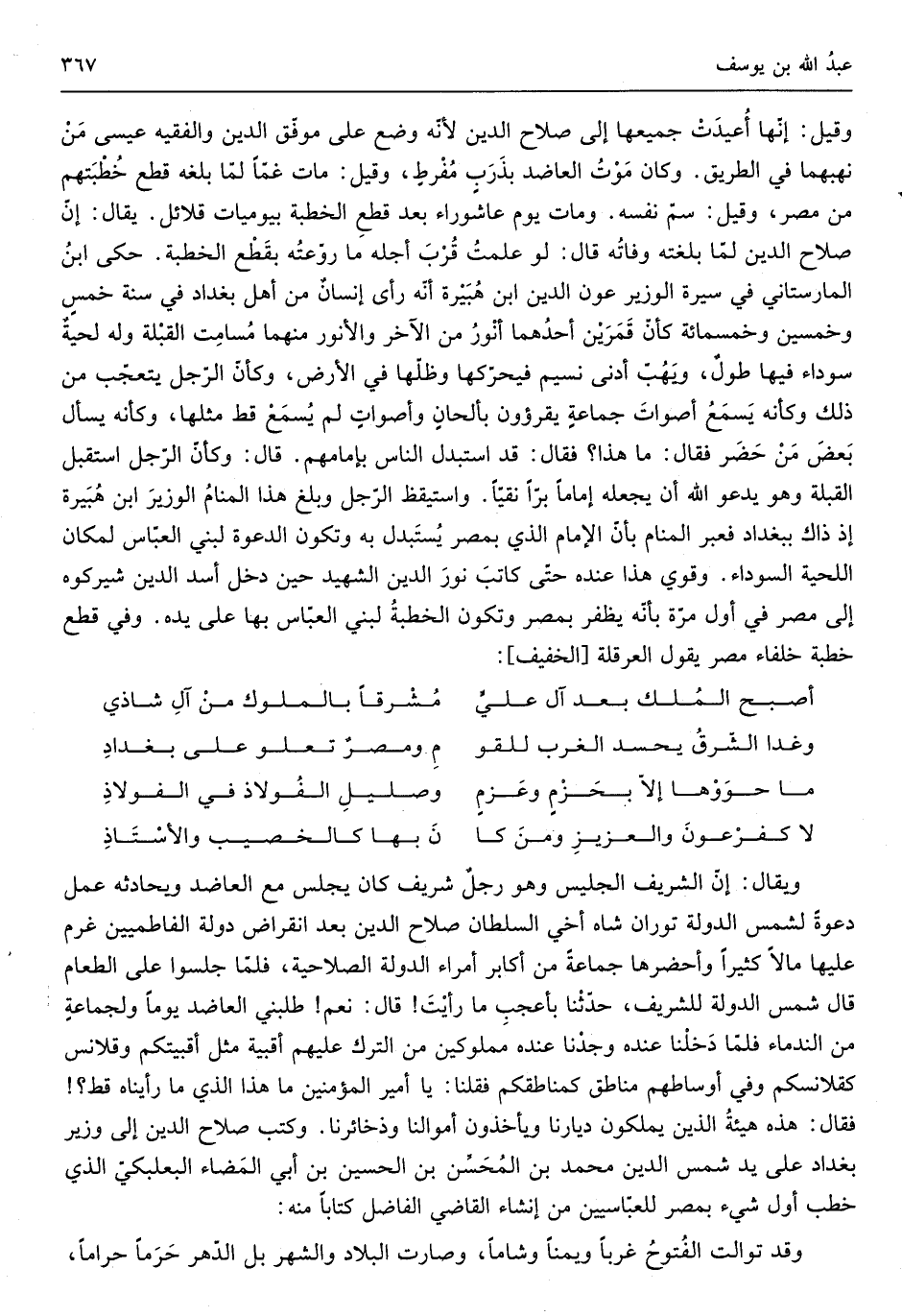 وَقيل إِنَّهَا أُعِيدَت جَمِيعهَا إِلَى صَلَاح الدّين لِأَنَّهُ وضع على موفق الدّين والفقيه عِيسَى من نهبهما فِي الطَّرِيق وَكَانَ موت العاضد بذربٍ مفرطٍ وَقيل مَاتَ غماً لما بلغه قطع خطبتهم من مصر وَقيل سم نَفسه وَمَات يَوْم عَاشُورَاء بعد قطع الْخطْبَة بيوميات قَلَائِل يُقَال إِن صَلَاح الدّين لما بلغته وَفَاته قَالَ لَو علمت قرب أَجله مَا رَوْعَته بِقطع الْخطْبَة حكى ابْن المارستاني فِي سيرة الْوَزير عون الدّين ابْن هُبَيْرَة أَنه رأى إنسانٌ من أهل بَغْدَاد فِي سنة خمسٍ وَخمسين وَخَمْسمِائة كَأَن قمرين أَحدهمَا أنور من الآخر والأنور مِنْهُمَا مسامت الْقبْلَة وَله لحيةٌ سَوْدَاء فِيهَا طولٌ ويهب أدنى نسيم فيحركها وظلها فِي الأَرْض وَكَأن الرجل يتعجب من ذَلِك وَكَأَنَّهُ يسمع أصوات جماعةٍ يقرؤن بألحانٍ وأصواتٍ لم يسمع قطّ مثلهَا وَكَأَنَّهُ يسْأَل بعض من حضر فَقَالَ مَا هَذَا فَقَالَ قد استبدل النَّاس بإمامهم قَالَ وَكَأن الرجل اسْتقْبل الْقبْلَة وَهُوَ يَدْعُو الله أَن يَجعله إِمَامًا برا نقياً