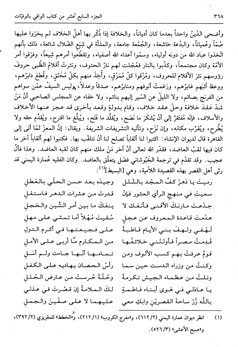 وأضحى الدّين وَاحِدًا بَعْدَمَا كَانَ أدياناً والخلافة إِذا ذكر بهَا أهل الْخلاف لم يخروا عَلَيْهَا صمًّا وعمياناً والبدعة خاشعة وَالْجُمُعَة جَامِعَة والمذلة فِي شيع الضلال شايعة ذَلِك بِأَنَّهُم آتخذوا عباد الله من دونه أَوْلِيَاء وَسموا أَعدَاء الله أصفياء وتقطعوا أَمرهم شيعًا وَفرقُوا أَمر الْأمة وَكَانَ مجتمعاً وكذبوا بالنَّار فَجعلت لَهُم نَار الحتوف وَنَثَرت أَقْلَام الظبى حُرُوف رؤوسهم نثر الأقلام للحروف ومزقوا كل ممزقٍ وَأخذ مِنْهُم بِكُل مخنقٍ وَقطع دابرهم وَوعظ آثبهم غابرهم ورغمت أنوفهم ومنابرهم صدقا وعدلاً وَلَيْسَ السَّيْف عَمَّن سواهُم من الفرنج بصائم وَلَا اللَّيْل عَن السّير إِلَيْهِم بنائم وَلَا خَفَاء عَن الْمجْلس الصاحبي أَن من شدّ عقد خلَافَة وَحل عقد خلاف وَقَامَ بدولةٍ وَقعد بِأُخْرَى قد عجز عَنْهَا الأخلاف والأسلاف فَإِنَّهُ مفتقرٌ إِلى أَن يشْكر مَا نصح ويقلد مَا فتح ويبلغ مَا اقترح وَيقدم حَقه وَلَا يطْرَح وَيقرب مَكَانَهُ وَإِن نزح وتأتيه التشريفات الشَّرِيفَة وَيُقَال إِن الْمعز لما أَتَى إِلَى الْقَاهِرَة قَالَ لديوان الْإِنْشَاء أكتبوا لنا ألقاباً تصلح لنا أَن نتلقب بهَا فَكَتَبُوا لَهُم ألقاباً آخر مَا كَانَ فِيهِ لقب العاضد فَقدر الله تَعَالَى أَن آخر من ملك مِنْهُم كَانَ لقبه العاضد وَهَذَا فألٌ عَجِيب وَقد تقدم فِي تَرْجَمَة الخبوشاني فصل يتَعَلَّق بالعاضد وَكَانَ الْفَقِيه عمَارَة اليمني قد رثى أهل الْقصر بِهَذِهِ القصيدة اللامية وَهِي من الْبَسِيط