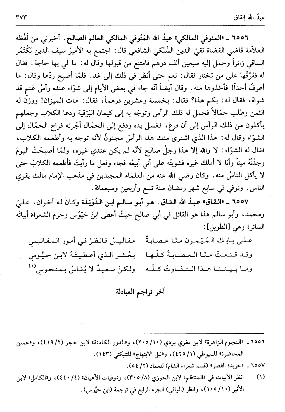 المنوفي الْمَالِكِي عبد الله بن المنوفي الْمَالِكِي الْعَالم الصَّالح أَخْبرنِي من لَفظه الْعَلامَة قَاضِي الْقُضَاة تَقِيّ الدّين السُّبْكِيّ الشَّافِعِي قَالَ إجتمع بِهِ الْأَمِير سيف الدّين بكتمر الساقي زَائِرًا وَحمل إِلَيْهِ سبعين ألف دِرْهَم فَامْتنعَ من قبُولهَا وَقَالَ لَهُ مَالِي بهَا حَاجَة فَقَالَ لَهُ ففرقها على من تخْتَار فَقَالَ نعم حَتَّى أنظر فِي ذَلِك إِلى غَد فَلَمَّا أصبح ردهَا وَقَالَ مَا أعرف أحدا فَأَخَذُوهَا مِنْهُ وَقَالَ أَيْضا أَنه جَاءَ فِي بعض الْأَيَّام إِلى شواء عِنْده رَأس غنمٍ قد شواه فَقَالَ لَهُ بكم هَذَا فَقَالَ بِخَمْسَة وَعشْرين درهما فَقَالَ هَات الْمِيزَان وَوزن لَهُ الثّمن وَطلب حمالاً فَحمل لَهُ ذَلِك الرَّأْس وَتوجه بِهِ إِلى كيمان البرقية ودعا الْكلاب وجعلهم من ذَلِك الرَّأْس إِلى أَن فرغ فَغسل يَده وَدفع إِلى الْحمال أجرته فراح الْحمال إِلى الشواء وَقَالَ لَهُ هَذَا الَّذِي أشترى مِنْك هَذَا الرَّأْس مجنونٌ لِأَنَّهُ توجه بِهِ وأطعمه الْكلاب فَقَالَ لَهُ الشواء وَلَا الله إِلَّا هَذَا رجلٌ صَالح لِأَنَّهُ لم يكن عِنْدِي غَيره وَلما أَصبَحت الْيَوْم وجدته مَيتا وَأَنا لَا أملك غَيره فشويته على أَنِّي أبيعه فجَاء وَفعل مَا رَأَيْت فأطعمه الْكلاب حَتَّى لَا يَأْكُل النَّاس مِنْهُ وَكَانَ رَضِي الله عَنهُ من الْعلمَاء المجيدين فِي مَذْهَب الإِمَام مَالك يقري النَّاس وَتُوفِّي فِي سَابِع شهر رَمَضَان سنة تسع وَأَرْبَعين وَسَبْعمائة