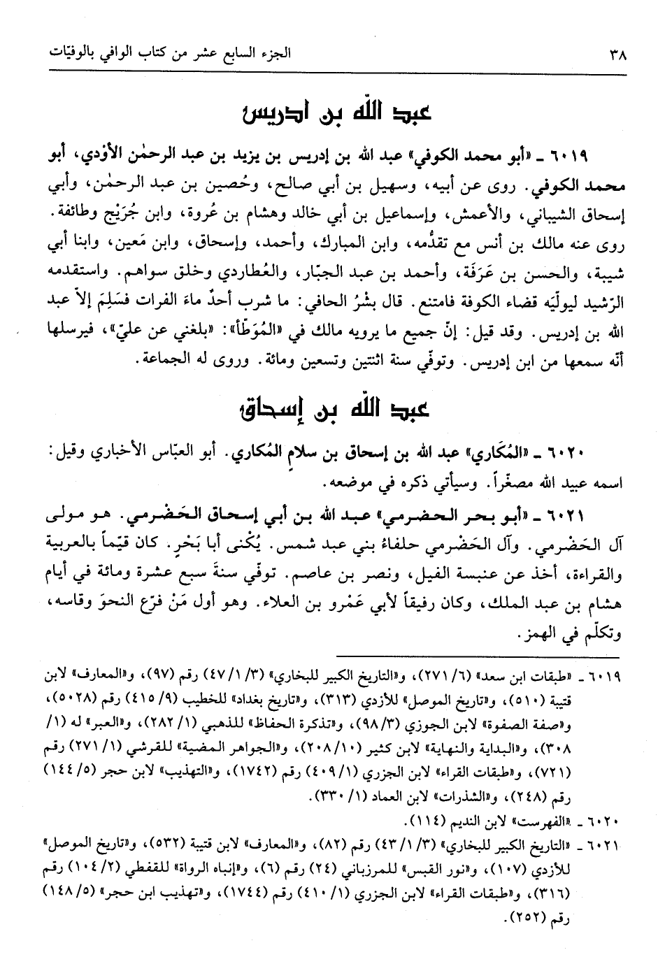 أَبُو مُحَمَّد الْكُوفِي عبد الله بن ادريس بن يزِيد بن عبد الرحمان الأودي أَبُو مُحَمَّد الْكُوفِي روى عَن أَبِيه وَسُهيْل بن أبي صَالح وحصين بن عبد الرحمان وَأبي إِسْحَاق الشَّيْبَانِيّ وَالْأَعْمَش وَإِسْمَاعِيل بن أبي خَالِد وَهِشَام بن عُرْوَة وَابْن جريج وَطَائِفَة روى عَنهُ ماك بن أنس مَعَ تقدمه وَابْن الْمُبَارك وَأحمد وَإِسْحَاق وَابْن معِين وابنا أبي شيبَة وَالْحسن بن عَرَفَة وَأحمد بن عبد الْجَبَّار والعطاردي وَخلق سواهُم واستقدمه الرشيد ليوليه قَضَاء الْكُوفَة فَامْتنعَ قَالَ بشر الحافي مَا شرب أحد مَاء الْفُرَات فَسلم إِلَّا عبد الله بن إِدْرِيس وَقد قيل إِن جَمِيع مَا يرويهِ مَالك فِي الْمُوَطَّأ بَلغنِي عَن عَليّ فيرسلها أَنه سَمعهَا من ابْن إِدْرِيس وَتُوفِّي سنة اثْنَتَيْنِ وَتِسْعين وَمِائَة وروى لَهُ الْجَمَاعَة