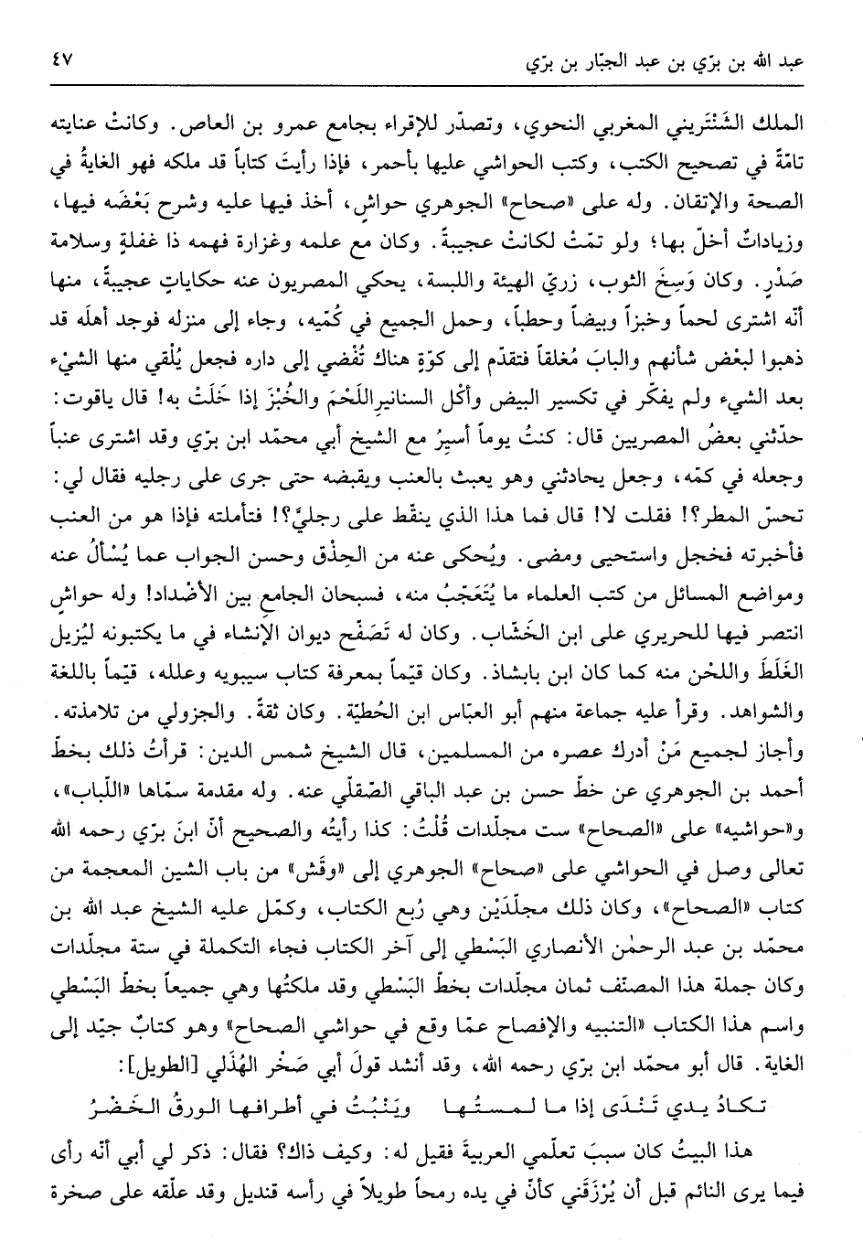 ابْن الخشاب وَكَانَ لَهُ تصفح ديوَان الْإِنْشَاء فِي مَا يكتبونه ليزيل الْغَلَط واللحن مِنْهُ كَمَا كَانَ ابْن بابشاذ وَكَانَ قيمًا بِمَعْرِِفَة كتاب سِيبَوَيْهٍ وَعلله قيمًا باللغة والشواهد وَقَرَأَ عَلَيْهِ جمَاعَة مِنْهُم أَبُو الْعَبَّاس ابْن الحطية كَانَ ثِقَة والجزولي من تلامذته وَأَجَازَ لجَمِيع من أدْرك عصره من الْمُسلمين قَالَ الشَّيْخ شمس الدّين قَرَأت ذَلِك بِخَط أَحْمد بن الْجَوْهَرِي عَن خطّ حسن بن عبد الْبَاقِي الصّقليّ عَنهُ وَله مُقَدّمَة سَمَّاهَا اللّبَاب وحواشيه على الصِّحَاح سِتّ مجلدات قلت كَذَا رَأَيْته وَالصَّحِيح أَن ابْن بري رَحمَه الله تَعَالَى وصل فِي الْحَوَاشِي على صِحَاح الْجَوْهَرِي إِلَى وقش من بَاب الشين الْمُعْجَمَة من كتاب الصِّحَاح وَكَانَ ذَلِك مجلدين وَهِي ربع الْكتاب وكمل عَلَيْهِ الشَّيْخ عبد الله بن مُحَمَّد بن عبد الرحمان الْأنْصَارِيّ البسطي إِلَى آخر الْكتاب فجَاء التكملة فِي سنة مجلدات وَكَانَ جملَة هَذَا المُصَنّف ثَمَان مجلدات بِخَط البسطي وَقد ملكتها وَهِي جَمِيعًا بِخَط البسطي وَاسم هَذَا الْكتاب التَّنْبِيه والإفصاح عَمَّا وَقع فِي حَوَاشِي الصِّحَاح وَهُوَ كتابٌ جيد إِلَى الْغَايَة قَالَ أَبُو مُحَمَّد ابْن بري رَحمَه الله وَقد أنْشد قَول أبي صَخْر الْهُذلِيّ من الطَّوِيل