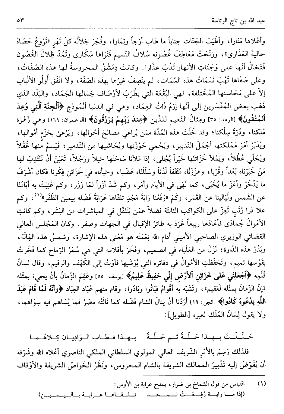 محاسنها الْمُخْتَلفَة فَهِيَ الْبقْعَة الَّتِي يطرب لأوصاف جمَالهَا الجماد والبلد الَّذِي ذهب بعض الْمُفَسّرين إِلَى أَنَّهَا إرام ذَات الماد وَهِي فِي الدُّنْيَا أنموذج الْجنَّة الَّتِي وعد المتقون وَمِثَال النَّعيم للَّذين عِنْد رَبهم يرْزقُونَ وَهِي زهرَة ملكنا ودرة سلكنا وَقد خلت هَذِه الْمدَّة مِمَّن يُرَاعِي مصَالح أحولها ويرعى بحزمٍ أموالها وَيُدبر أَمر مملكتها أجمل التَّدْبِير ويحمي حوزتها ويُحاشيها من التدمير فيسم مِنْهَا غفلاً ويحلي عطلاً ويملأ خزائنها خيرا يجلى إِذا ملأنا ساحتها خيلاً ورجلاً تعين أَن ننتدب لَهَا من خبرناه بعدا وقربا وهززناه مثقفا لدنا وسللناه عضبا وخبأناه فِي خَزَائِن فكرنا فَكَانَ أشرف مَا يدّخر وأعز مَا يخبى كم نهى فِي الْأَيَّام وَأمر وَكم شدّ أزراً لما وزر وَكم غنيت بِهِ أيامنا عَن الشَّمْس وليالينا عَن الْقَمَر وَكم رفعنَا راية مجدٍ تلقاها عرابة فَضله بِيَمِين الظفر وَكم علا ذرا رتبٍ تعز على الْكَوَاكِب الثَّابِتَة فضلا عَمَّن يتنقل فِي المباشرات من الْبشر وَكم كَانَت الْأَمْوَال جُمَادَى فَأَعَادَهَا ربيعاً غرد بِهِ طَائِر الإقبال فِي الْجِهَات وصفر وَكَانَ الْمجْلس العالي القضائي الوزيري الصاحبي الأميني أدام الله نعْمَته هُوَ معنى هَذِه الْإِشَارَة وشمس هَذ الهالة وَبدر هَذِه الدارة نزل من العلياء فِي الصميم وفخر بأقلامه الَّتِي هِيَ سمر الرماح كَمَا فخرت بقوسها تَمِيم وتحفظت الْأَمْوَال فِي دفاتره الَّتِي يوشيها فآوت إِلَى الْكَهْف والرقيم وَقَالَ لِسَان قلمه إجعلني على خَزَائِن الأَرْض إِنِّي حفيظٌ عليم وعقم الزَّمَان بِأَن يَجِيء بِمثلِهِ إِن الزَّمَان بِمثلِهِ لعقيم وتشبه بِهِ أَقوام فبانوا وبادوا وَقَامَ مِنْهُم عباد الْعباد فَلَمَّا قَامَ عبد الله يَدعُوهُ كَادُوا أردنَا أَن ينَال الشَّام فَضله كَمَا نالته مصر فَمَا يساهم فِيهِ سواهُمَا وَلَا يَقُول لِسَان الْملك لغيره من الطَّوِيل