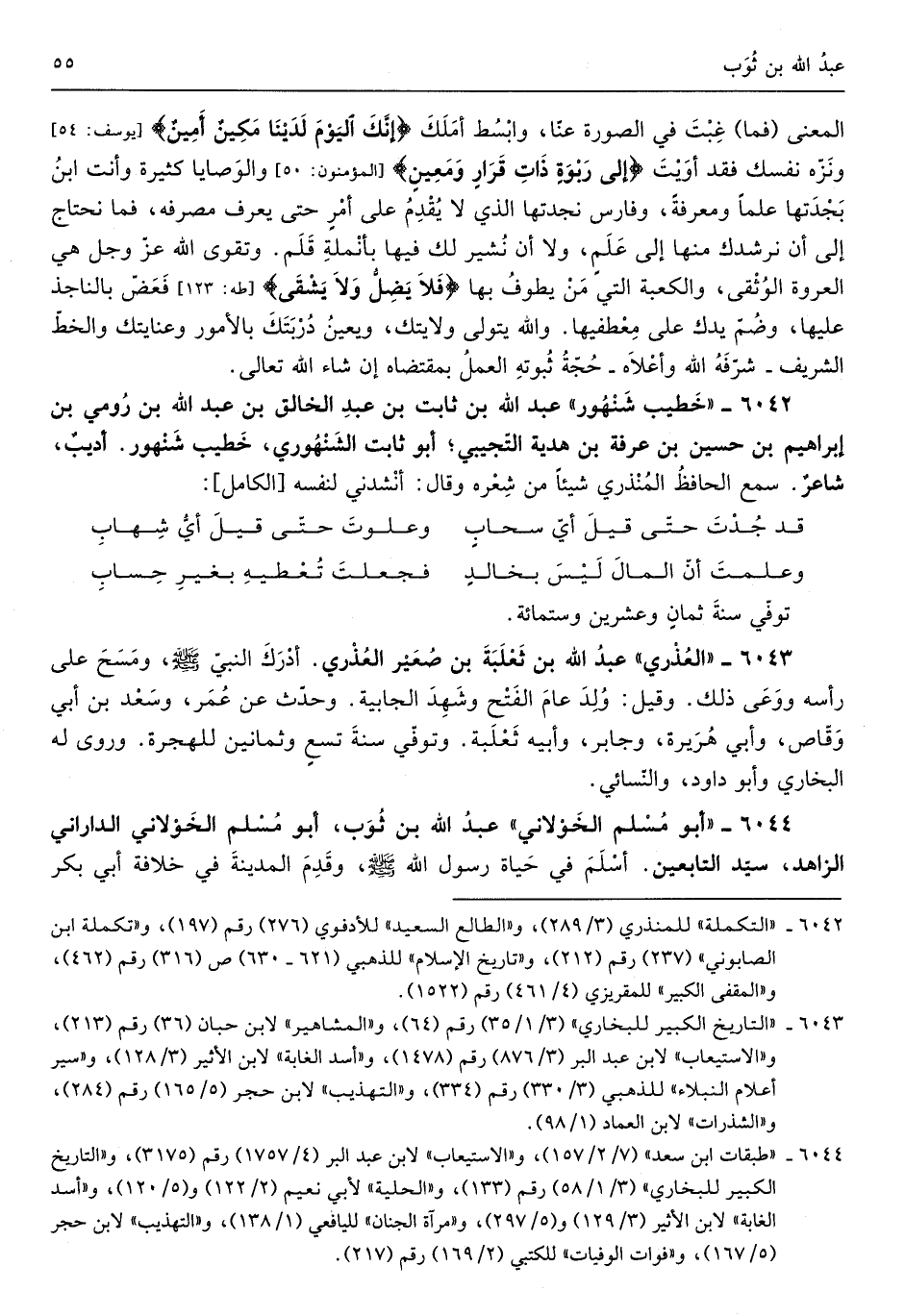 أَبُو مُسلم الْخَولَانِيّ عبد الله بن ثوب أَبُو مُسلم الْخَولَانِيّ الدَّارَانِي الزَّاهِد سيد التَّابِعين أسلم فِي حَيَاة رَسُول الله صلى الله عَلَيْهِ وَسلم وَقدم الْمَدِينَة فِي خلَافَة أبي بكر