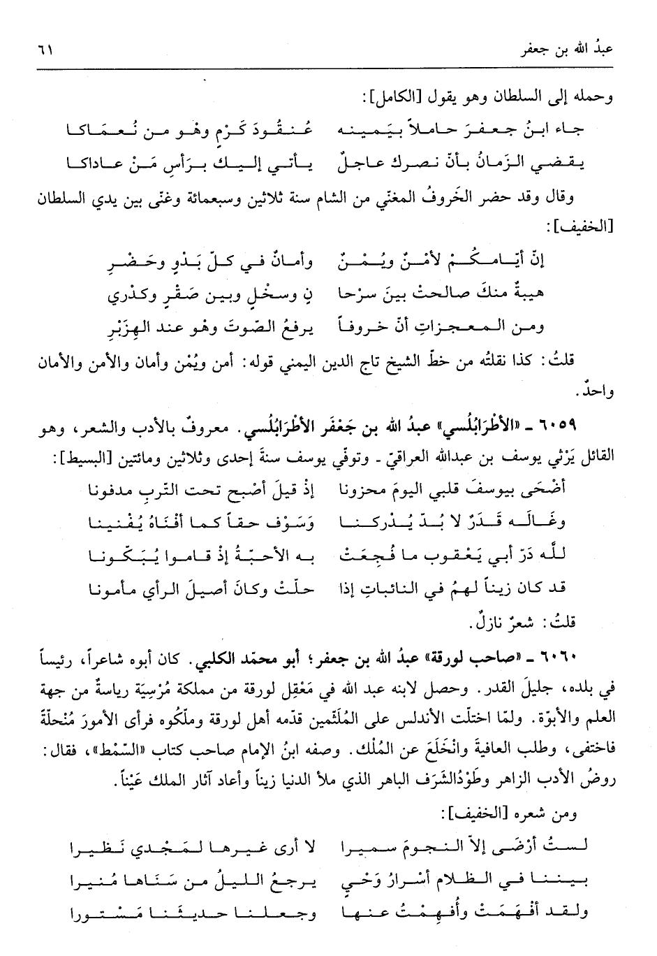 الأطرابلسي عبد الله بن جَعْفَر الأطرابلسي معروفٌ بالأدب وَالشعر وَهُوَ الْقَائِل يرثي يُوسُف بن عبد الله الْعِرَاقِيّ وَتُوفِّي يُوسُف سنة إِحْدَى وَثَلَاثِينَ وَمِائَتَيْنِ من الْبَسِيط