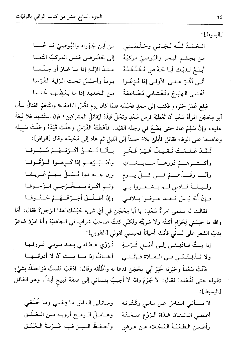 فَقَالَت لَهُ سلمى امْرَأَة سعدٍ يَا أَبَا محجن فِي أَي شَيْء حَبسك هَذَا الرجل فَقَالَ أما وَالله مَا حَبَسَنِي لحرامٍ أَكلته وَلَا شربته وَلَكِنِّي كنت صَاحب شرابٍ فِي الْجَاهِلِيَّة وَأَنا امْرُؤ شاعرٌ يدب الشّعْر على لساني فأنفثه أَحْيَانًا فحبسني لقولي من الطَّوِيل
