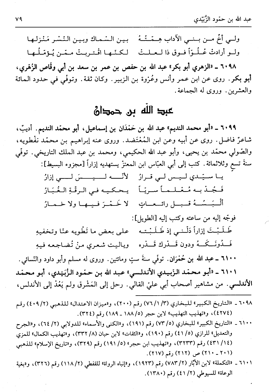 أَبُو مُحَمَّد النديم عبد الله بن حمدَان بن إِسْمَاعِيل أَبُو مُحَمَّد النديم أديبٌ شاعرٌ فَاضل روى عَن أَبِيه وَعَن ابْن المعتضد وروى عَنهُ إِبْرَاهِيم بن مُحَمَّد نفطويه والصولي مُحَمَّد بن يحيى وَأَبُو عبد الله الحكيمي وَمُحَمّد بن عبد الْملك التاريخي توفّي سنة تسعٍ وثلاثمائة كتب إِلَى أبي الْعَبَّاس ابْن المعتز يستهديه إزاراً من مجزوء الْبَسِيط
