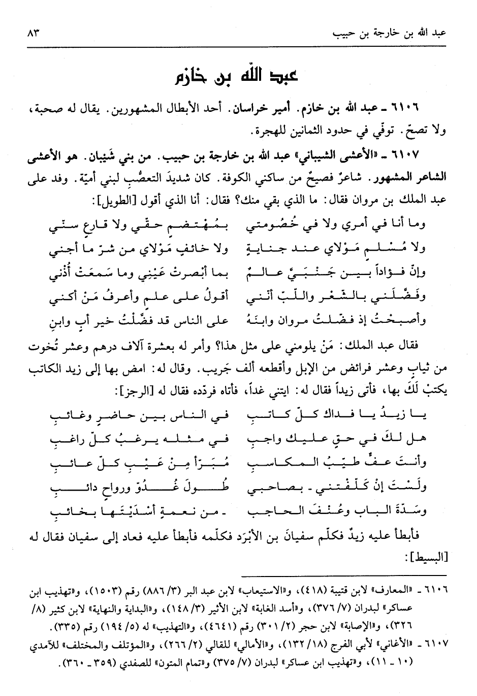 الأعشي الشَّيْبَانِيّ عبد الله بن خَارِجَة بن حبيب من بني شَيبَان هُوَ الْأَعْشَى الشَّاعِر الْمَشْهُور شاعرٌ فصيحٌ من سَاكِني الْكُوفَة كَانَ شَدِيد التعصب لبني أُميَّة وَفد على عبد الْملك بن مَرْوَان فَقَالَ ماالذي بَقِي مِنْك فَقَالَ أَنا الَّذِي أَقُول من الطَّوِيل