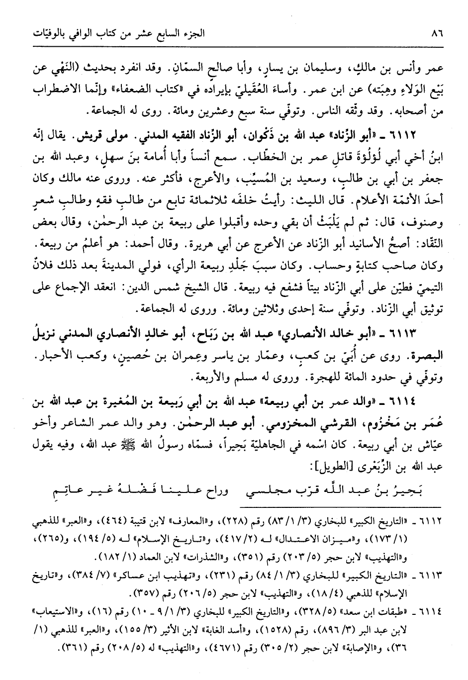 أَبُو الزِّناد عبد الله بن ذكْوَان أَبُو الزِّنَاد الْفَقِيه الْمدنِي مولى قُرَيْش يُقَال إِنَّه ابْن أخي أبي لؤلؤة قَاتل عمر بن الْخطاب سمع أنسا وَأَبا أُمَامَة ابْن سهلٍ وَعبد الله بن جَعْفَر بن أبي طَالب وَسَعِيد بن الْمسيب والأعرج فَأكْثر عَنهُ وروى عَنهُ مَالك وَكَانَ أحد الْأَئِمَّة الْأَعْلَام قَالَ اللَّيْث رَأَيْت خَلفه ثَلَاثمِائَة تَابع من طَالب فقهٍ وطالب شعرٍ وصنوف قَالَ ثمَّ لم يلبث أَن بَقِي وَحده وَأَقْبلُوا على ربيعَة بن عبد الرحمان وَقَالَ بعض النقاد أصح الْأَسَانِيد أَبُو الزِّنَاد عَن الْأَعْرَج عَن أبي هُرَيْرَة وَقَالَ أَحْمد هُوَ أعلم من ربيعَة وَكَانَ صَاحب كتابةٍ وحساب وَكَانَ سَبَب جلد ربيعَة الرَّأْي فولي الْمَدِينَة بعد ذَلِك فلانٌ التَّيْمِيّ فطين على أبي الزِّنَاد بَيْتا فشفع فِيهِ)