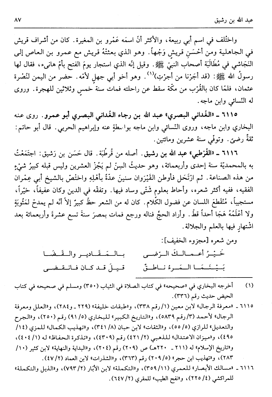 الْقُرْطُبِيّ عبد الله بن رَشِيق أَصله من قرطبة قَالَ حسن بن رَشِيق إجتمعت بِهِ بالمحمدية سنة إِحْدَى وَأَرْبَعمِائَة وَهُوَ حَدِيث السن لم يجز الْعشْرين وَلَيْسَ فبله كَبِير شيءٍ من هَذِه الصِّنَاعَة ثمَّ ارتحل فأوطن القيروان سِنِين عدَّة بأَهْله واختص بالشيخ أبي عمرَان الْفَقِيه فَفِيهِ أَكثر شعره)