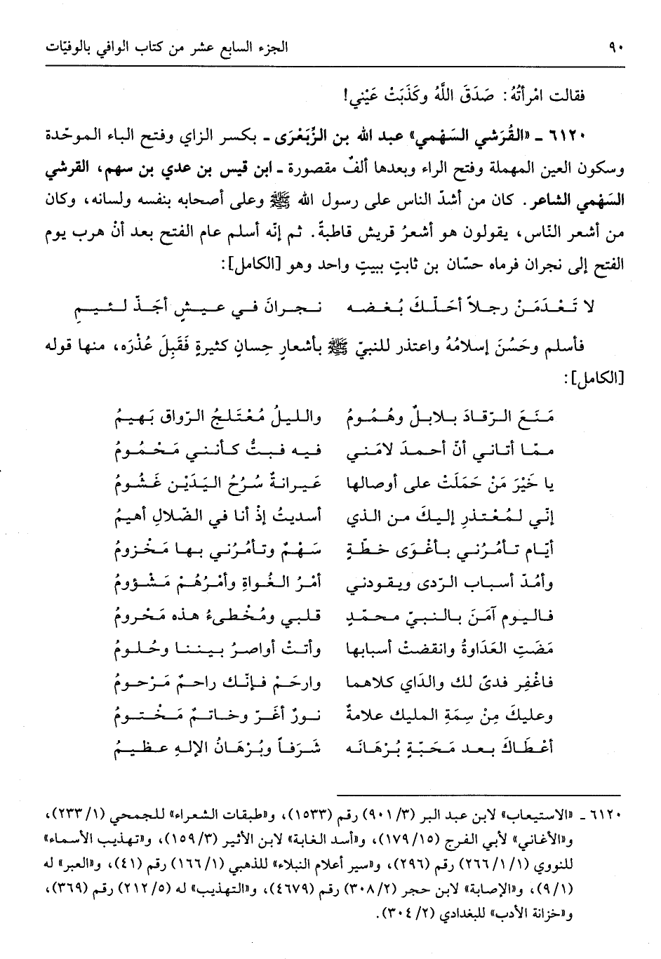 الْقرشِي السَّهْمِي عبد الله بن الزبعري بِكَسْر الزَّاي وَفتح الْبَاء الْمُوَحدَة وَسُكُون الْعين الْمُهْملَة وَفتح الرَّاء وَبعدهَا ألفٌ مَقْصُورَة ابْن قيس بن عدي بن سهم الْقرشِي السَّهْمِي الشَّاعِر كَانَ من أَشد النَّاس على رَسُول الله صلى الله عَلَيْهِ وَسلم وعَلى أَصْحَابه بِنَفسِهِ وَلسَانه وَكَانَ من أشعر النَّاس يَقُولُونَ هُوَ أشعر قُرَيْش قاطبةً ثمَّ إِنَّه أسلم عَام الْفَتْح بعد أَن هرب يَوْم الْفَتْح إِلَى نَجْرَان فَرَمَاهُ حسان بن ثَابت ببيتٍ وَاحِد وَهُوَ من الْكَامِل