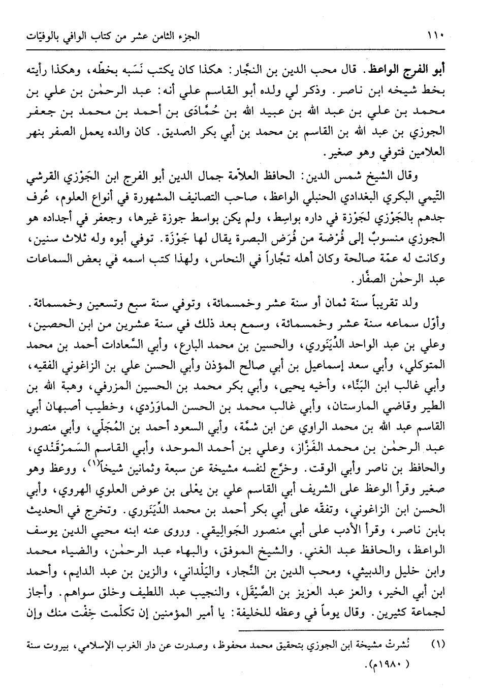 وَقَالَ الشَّيْخ شمس الدّين الْحَافِظ الْعَلامَة جمال الدّين أَبُو الْفرج ابْن الْجَوْزِيّ الْقرشِي التَّيْمِيّ الْبكْرِيّ البغداذي الْحَنْبَلِيّ الْوَاعِظ صَاحب التصانيف الْمَشْهُورَة فِي أَنْوَاع الْعُلُوم عرف جدهم بالجوزي لجوزة فِي دَاره بواسط وَلم يكن بواسط جوزة غَيرهَا وجعفر فِي أجداده هُوَ الْجَوْزِيّ مَنْسُوب إِلَى فرضة من فرض الْبَصْرَة يُقَال لَهَا جوزة توفّي أَبوهُ وَله ثَلَاث سِنِين وَكَانَت لَهُ عمَّة صَالِحَة وَكَانَ أَهله تجارًا فِي النّحاس وَلِهَذَا كتب اسْمه فِي بعض السماعات عبد الرَّحْمَن الصفار