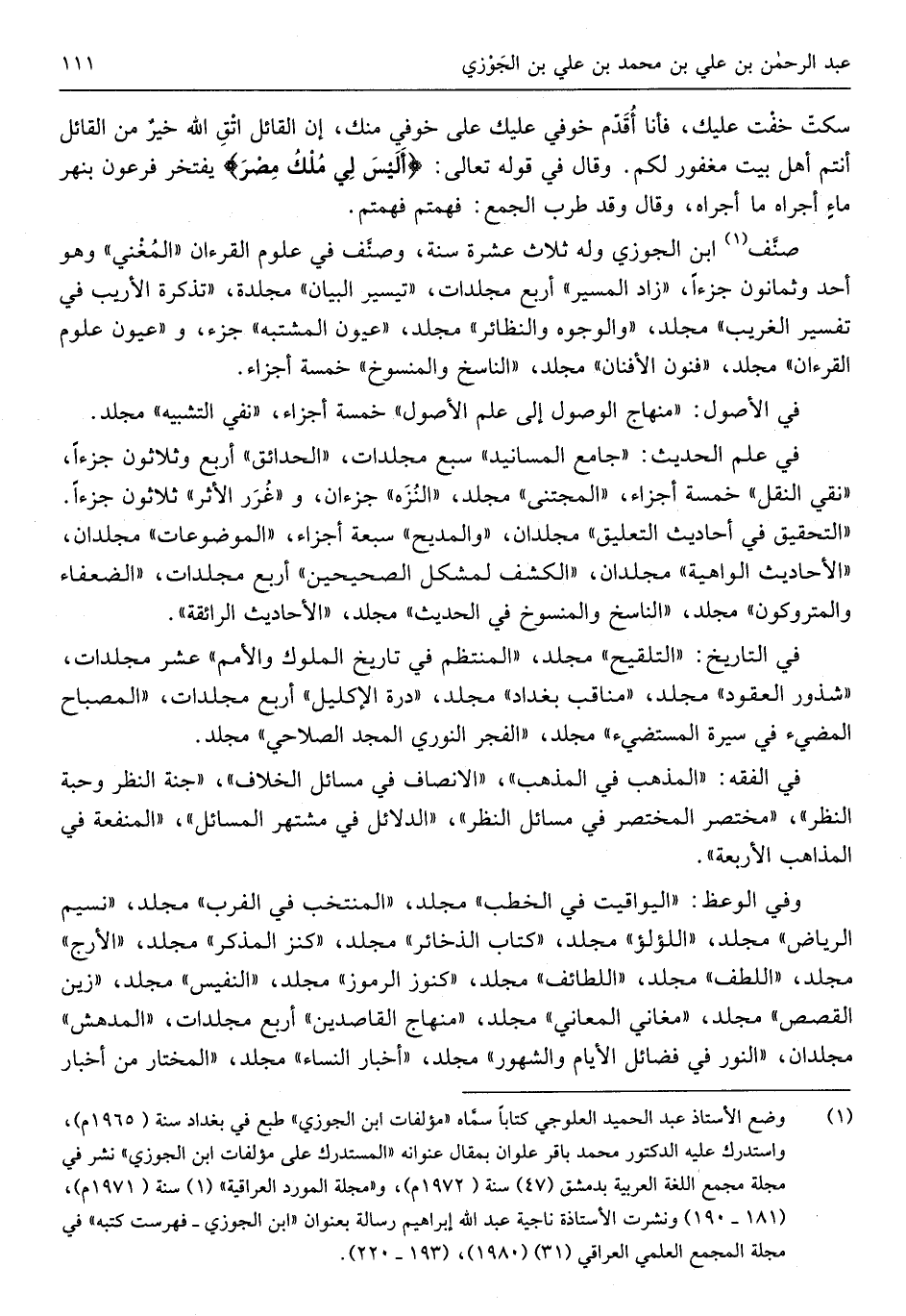 صنف ابْن الْجَوْزِيّ وَله ثَلَاث عشرَة سنة وصنف فِي عُلُوم الْقُرْآن الْمُغنِي وَهُوَ أحد وَثَمَانُونَ جُزْءا زَاد الْمسير أَربع مجلدات تيسير الْبَيَان مجلدة تذكرة الأريب فِي تَفْسِير الْغَرِيب مُجَلد وَالْوُجُوه والنظائر مُجَلد عُيُون المشتبه جُزْء وعيون عُلُوم الْقُرْآن مُجَلد وفنون الأفنان مُجَلد النَّاسِخ والمنسوخ خَمْسَة أَجزَاء