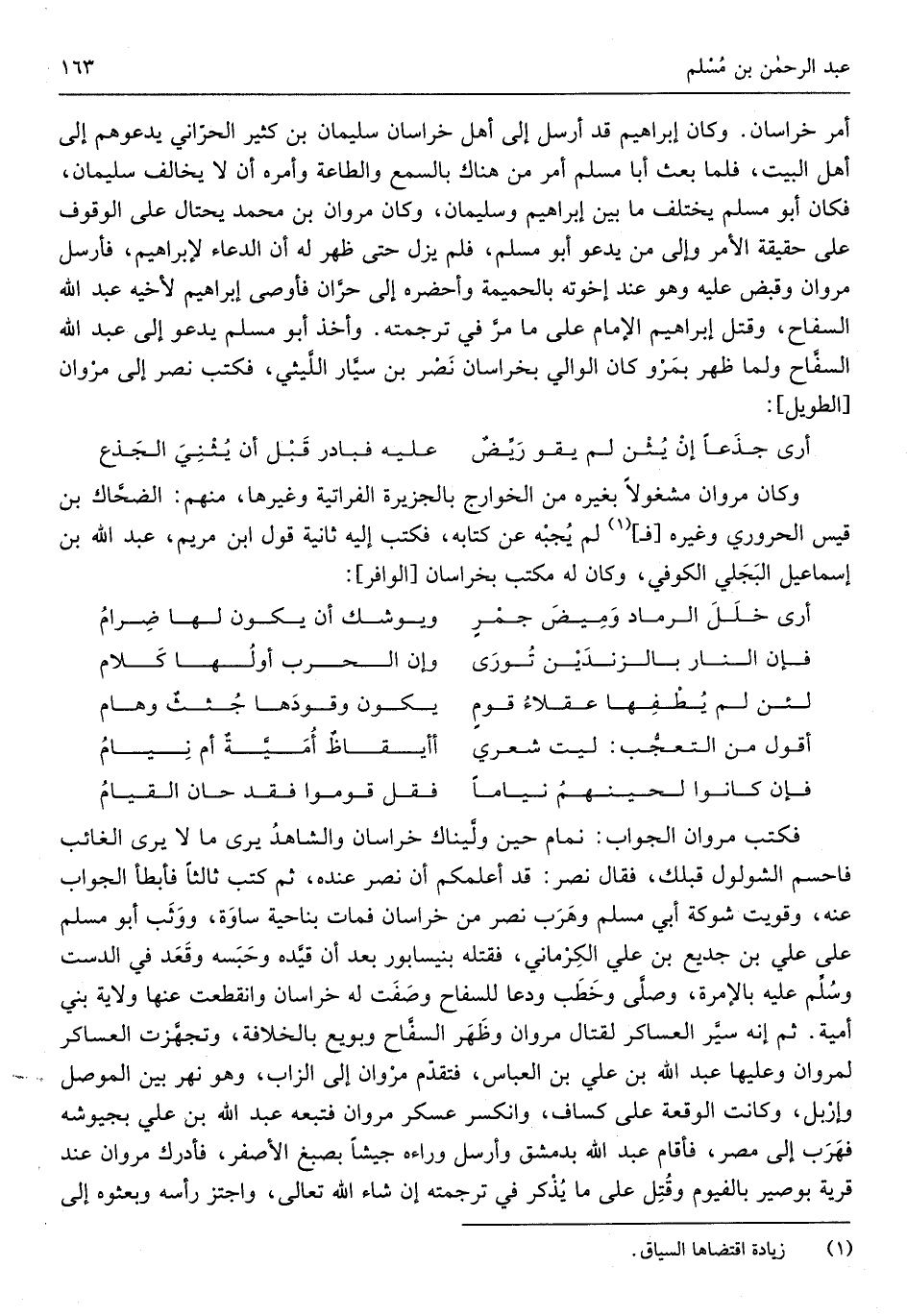 أَمر خُرَاسَان وَكَانَ إِبْرَاهِيم قد أرسل إِلَى أهل خُرَاسَان سُلَيْمَان بن كثير الْحَرَّانِي يَدعُوهُم إِلَى أهل الْبَيْت فَلَمَّا بعث أَبَا مُسلم أَمر من هُنَاكَ بِالسَّمْعِ وَالطَّاعَة وَأمره أَن لَا يُخَالف سُلَيْمَان فَكَانَ أَبُو مُسلم يخْتَلف مَا بَين إِبْرَاهِيم وَسليمَان وَكَانَ مَرْوَان بن مُحَمَّد يحتال على الْوُقُوف على حَقِيقَة الْأَمر وَإِلَى من يَدْعُو أَبُو مُسلم فَلم يزل حَتَّى ظهر لَهُ أَن الدُّعَاء لإِبْرَاهِيم فَأرْسل مَرْوَان وَقبض عَلَيْهِ وَهُوَ عِنْد إخْوَته بالحميمة وأحضره إِلَى حران فأوصى إِبْرَاهِيم لِأَخِيهِ عبد الله السفاح وَقتل إِبْرَاهِيم الإِمَام على مَا مر فِي تَرْجَمته وَأخذ أَبُو مُسلم يَدْعُو إِلَى عبد الله السفاح وَلما ظهر بمرو كَانَ الْوَالِي بخراسان نصر بن سيار اللَّيْثِيّ فَكتب نصر إِلَى مَرْوَان الطَّوِيل