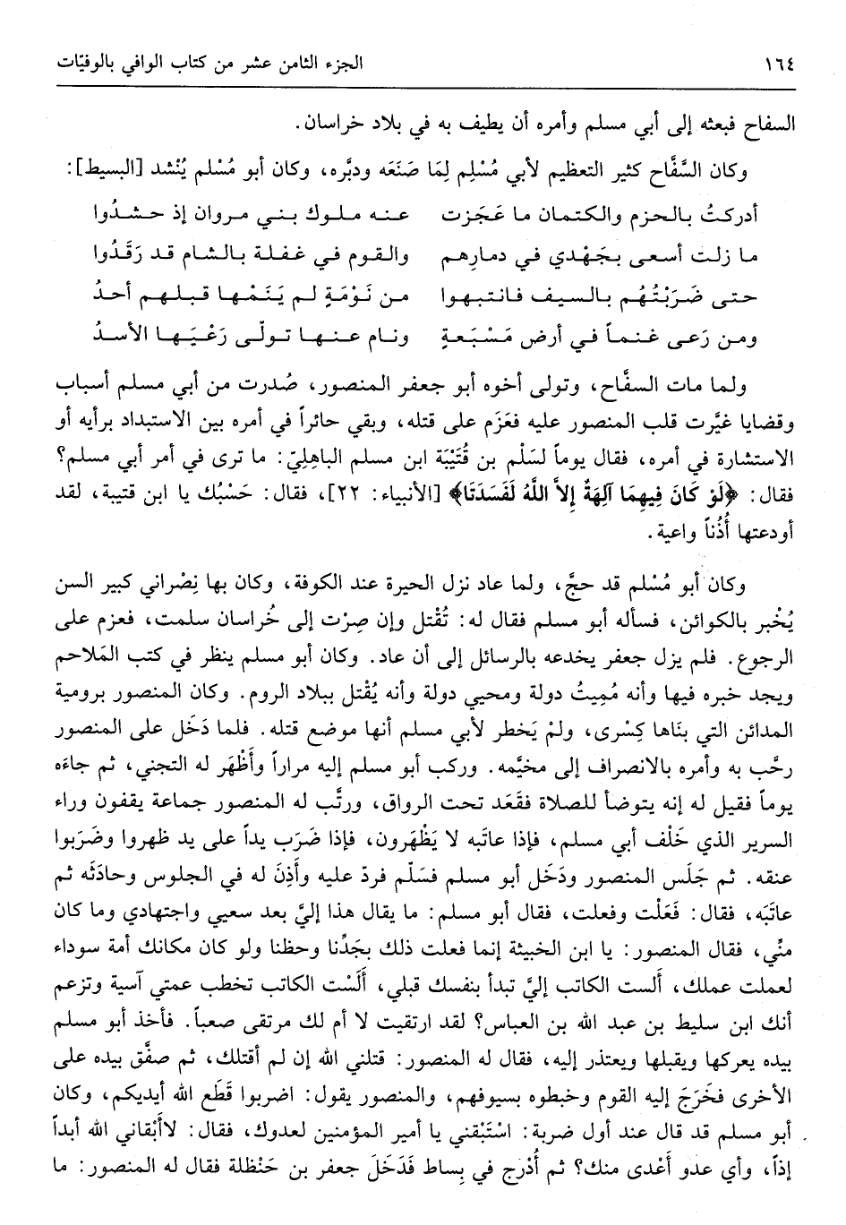 وَكَانَ السفاح كثير التَّعْظِيم لأبي مُسلم لما صنعه وَدبره وَكَانَ أَبُو مُسلم ينشد الْبَسِيط
