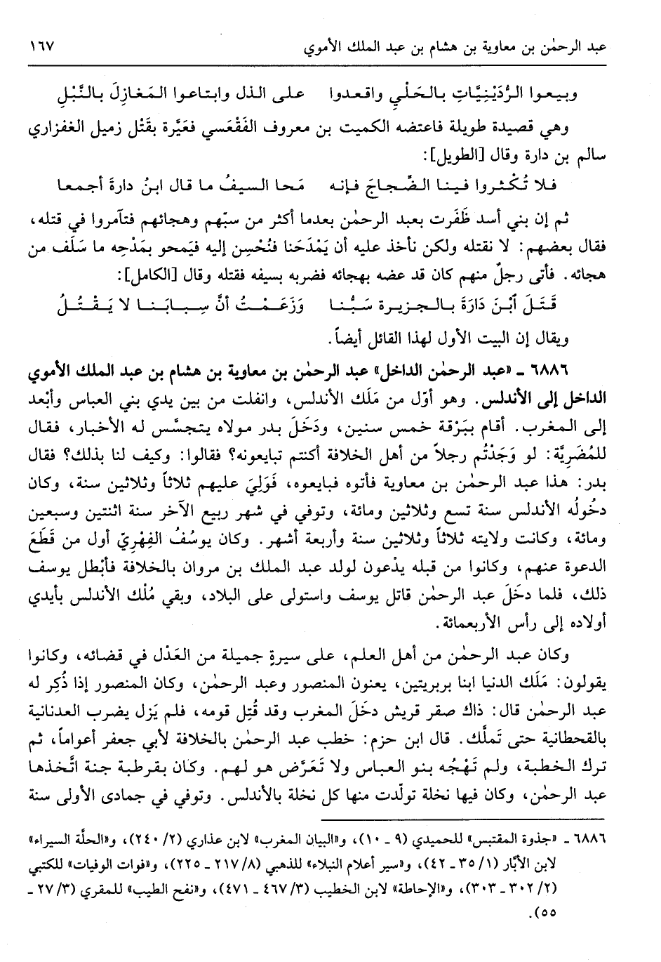 عبد الرَّحْمَن بن مُعَاوِيَة بن هِشَام بن عبد الْملك الْأمَوِي الدَّاخِل إِلَى الأندلس وَهُوَ أول من ملك الأندلس وانفلت من بَين يَدي بني الْعَبَّاس وَأبْعد إِلَى الْمغرب أَقَامَ ببرقة خمس سِنِين وَدخل بدر مَوْلَاهُ يتجسس لَهُ الْأَخْبَار فَقَالَ للمضرية لَو وجدْتُم رجلا من أهل الْخلَافَة أَكُنْتُم تبايعونه فَقَالُوا وَكَيف لنا بذلك فَقَالَ بدر هَذَا عبد الرَّحْمَن بن مُعَاوِيَة فَأتوهُ فَبَايعُوهُ فولي عَلَيْهِم ثَلَاثًا وَثَلَاثِينَ سنة وَكَانَ دُخُوله الأندلس سنة تسع وَثَلَاثِينَ وَمِائَة وَتُوفِّي فِي شهر ربيع الآخر سنة)