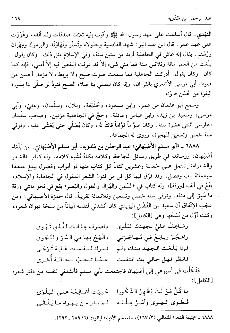 عبد الرَّحْمَن بن مندويه أَبُو مُسلم الْأَصْبَهَانِيّ من بلغاء أَصْبَهَان ورسائله فِي طَرِيق رسائل الجاحظ وَكَلَامه يكَاد يشبه كَلَامه وَله كتاب الشّعْر وَالشعرَاء يشْتَمل على خَمْسَة وَعشْرين كتابا كل كتاب مِنْهَا ذُو أَبْوَاب وفصول يبلغ عَددهَا سبع مائَة بَاب وَفصل وَقد فرق فِيهَا كل فن من فنون الشّعْر الْمَقُول فِي الْجَاهِلِيَّة وَالْإِسْلَام يَقع فِي ألف ورقة وَله كتاب فِي السّمن والهزال والطول وَالْقصر يَقع فِي نَحْو مِائَتي ورقة مَا سبق إِلَى مثله وَتُوفِّي سنة خمس وَتِسْعين وَثَلَاث مائَة تَقْرِيبًا قَالَ حَمْزَة الْأَصْبَهَانِيّ وَمن عجب الِاتِّفَاق أَن سعيد بن الْفضل)