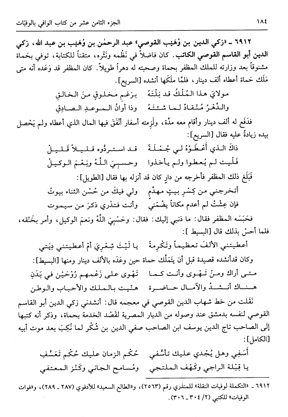 عبد الرَّحْمَن بن وهيب بن عبد الله زكي الدّين أَبُو الْقَاسِم القوصي الْكَاتِب كَانَ فَاضلا فِي نظمه ونثره متقناً للكتابة توفّي بحماة مشنوقاً بعد وزارته للْملك المظفر بحماة وصحبته لَهُ دهراً طَويلا كَانَ المظفر قد وعده أَنه مَتى ملك حماة أعطَاهُ ألف دِينَار فَلَمَّا ملكهَا أنْشدهُ السَّرِيع