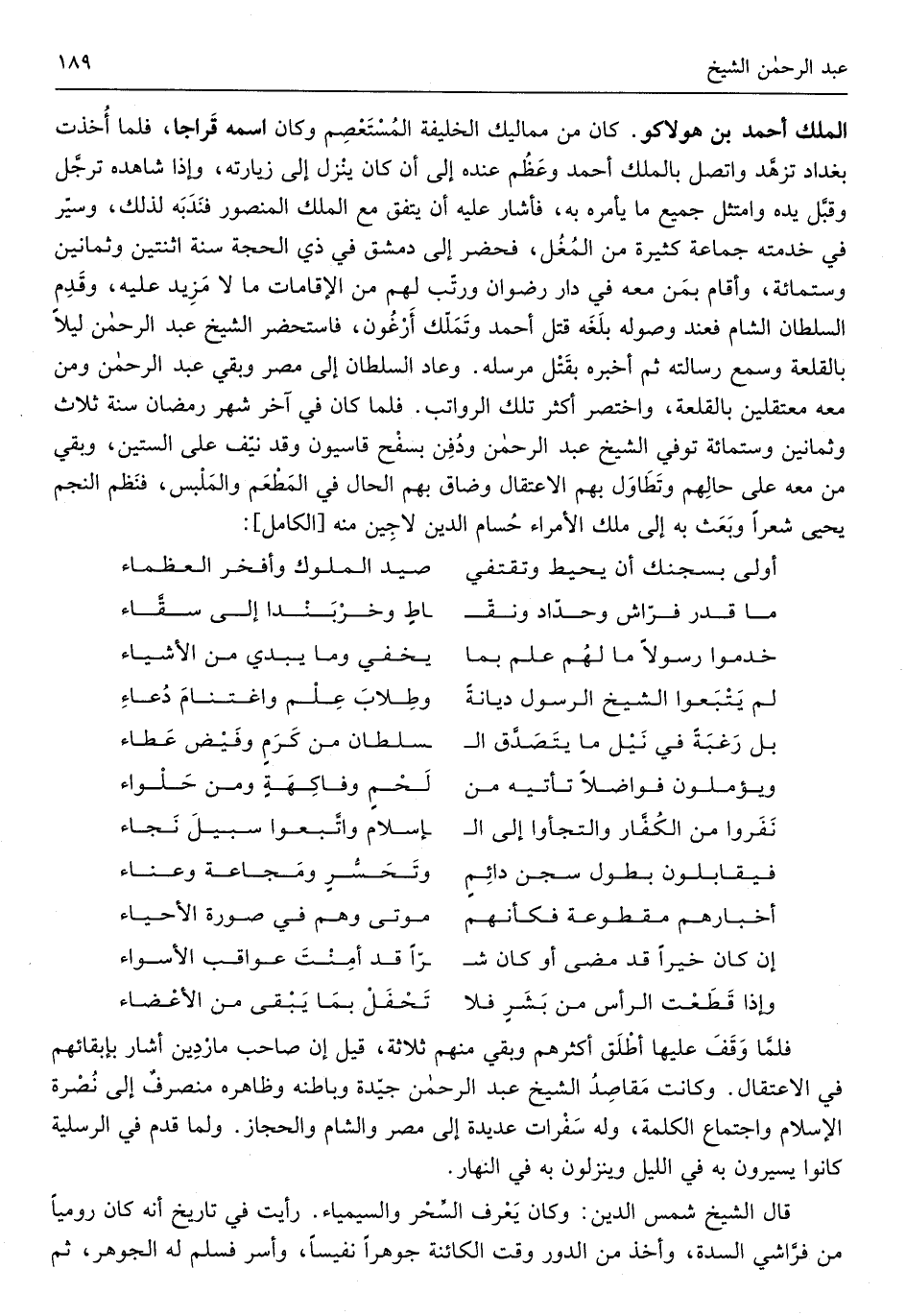 الْملك أَحْمد بن هولاكو كن من مماليك الْخَلِيفَة المستعصم وَكَانَ اسْمه قراجا فَلَمَّا أخذت بغداذ تزهد واتصل بِالْملكِ أَحْمد وَعظم عِنْده إِلَى أَن كَانَ ينزل إِلَى زيارته وَإِذا شَاهده ترجل وَقبل يَده وامتثل جَمِيع مَا يَأْمُرهُ بِهِ فَأَشَارَ عَلَيْهِ أَن يتَّفق مَعَ الْملك الْمَنْصُور فندبه لذَلِك وسير فِي خدمته جمَاعَة كَثِيرَة من الْمغل فَحَضَرَ إِلَى دمشق فِي ذِي الْحجَّة سنة اثْنَتَيْنِ وَثَمَانِينَ وست مائَة وَأقَام بِمن مَعَه فِي دَار رضوَان ورتب لَهُم من الإقامات مَا لَا مزِيد عَلَيْهِ وَقدم السُّلْطَان الشَّام فَعِنْدَ وُصُوله بلغه قتل أَحْمد وتملك أرغون فَاسْتَحْضر الشَّيْخ عبد الرَّحْمَن لَيْلًا بالقلعة وَسمع رسَالَته ثمَّ أخبرهُ بقتل مرسله وَعَاد السُّلْطَان إِلَى مصر وَبَقِي عبد الرَّحْمَن وَمن مَعَه معتقلين بالقلعة وَاخْتصرَ أَكثر تِلْكَ الرَّوَاتِب فَلَمَّا كَانَ فِي آخر شهر رَمَضَان سنة ثَلَاث وَثَمَانِينَ وست مائَة توفّي الشَّيْخ عبد الرَّحْمَن وَدفن بسفح قاسيون وَقد نَيف على السِّتين وَبَقِي من مَعَه على حَالهم وتطاول بهم الاعتقال وضاق بهم الْحَال فِي الْمطعم والملبس فنظم النَّجْم يحيى شعرًا وَبعث بِهِ إِلَى ملك الْأُمَرَاء حسام الدّين لاجين مِنْهُ الْكَامِل