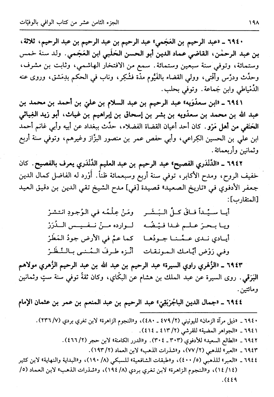 عبد الرَّحِيم بن عبد الرَّحِيم بن عبد الرَّحِيم ثَلَاثَة بن عبد الرَّحْمَن القَاضِي عماد الدّين أَبُو الْحسن الْحلَبِي ابْن العجمي ولد سنة خمس وست مائَة وَتُوفِّي سنة سبعين وست مائَة سمع من الافتخار الْهَاشِمِي وثابت بن مشرف وَحدث ودرس وَأفْتى وَولي الْقَضَاء بالفيوم مُدَّة)