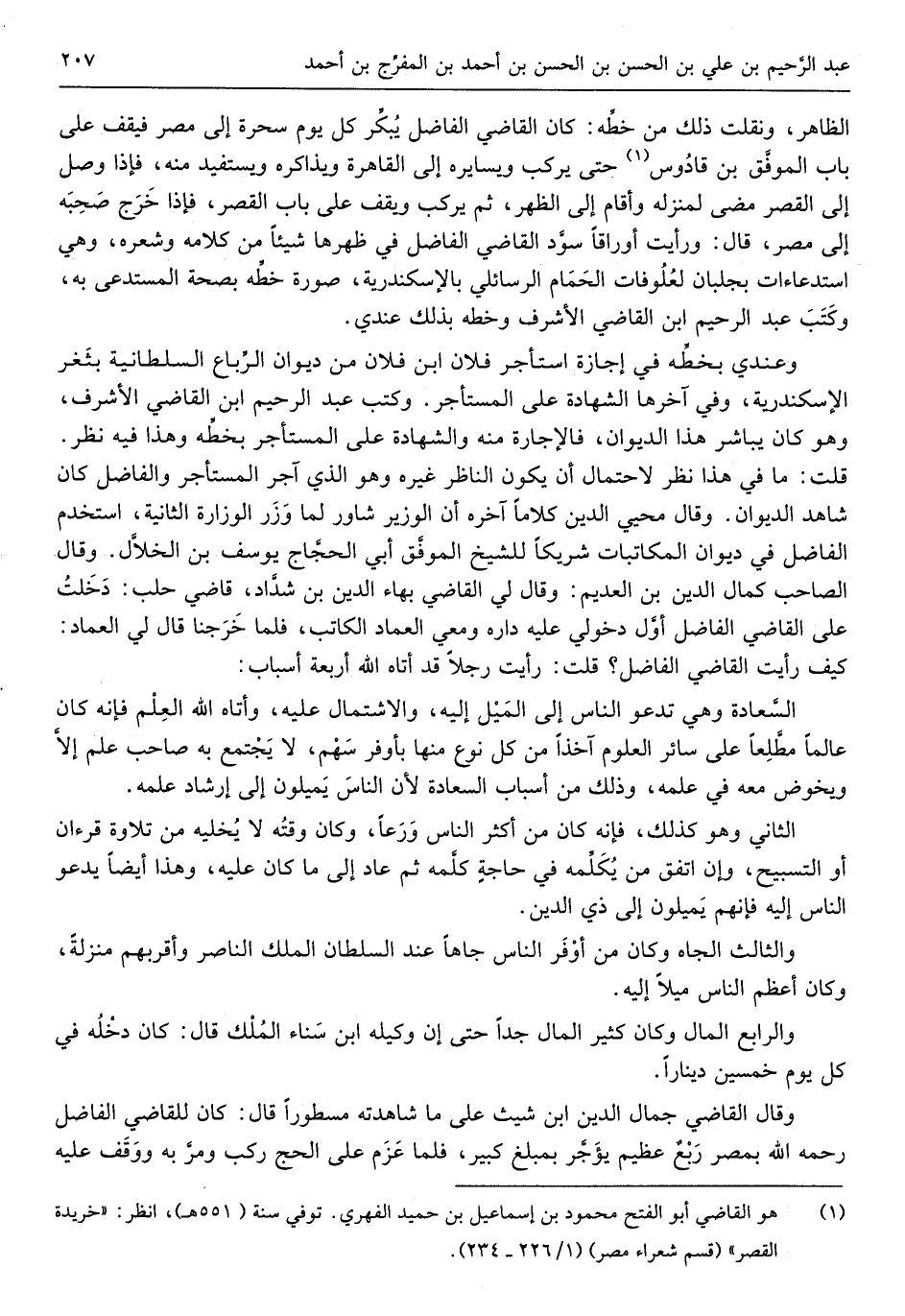 الظَّاهِر ونقلت ذَلِك من خطه كَانَ القَاضِي الْفَاضِل يبكر كل يَوْم سحرة إِلَى مصر فيقف على بَاب الْمُوفق بن قادوس حَتَّى يركب ويسايره إِلَى الْقَاهِرَة ويذاكره ويستفيد مِنْهُ فَإِذا وصل إِلَى الْقصر مضى لمنزله وَأقَام إِلَى الظّهْر ثمَّ يركب وَيقف على بَاب الْقصر فَإِذا خرج صَحبه إِلَى مصر قَالَ وَرَأَيْت أوراقاً سود القَاضِي الْفَاضِل فِي ظهرهَا شَيْئا من كَلَامه وشعره وَهِي استدعاءات بجلبان لعلوفات الْحمام الرسائلي بالإسكندرية وَصُورَة خطه بِصِحَّة المستدعى بِهِ وَكتب عبد الرَّحِيم ابْن القَاضِي الْأَشْرَف وخطه بذلك عِنْدِي