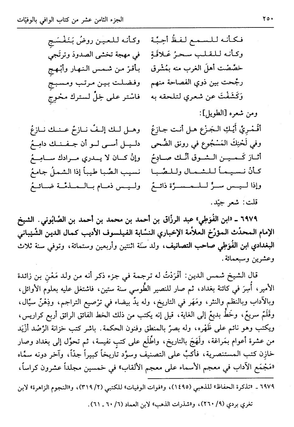 عبد الرَّزَّاق بن أَحْمد بن مُحَمَّد بن أَحْمد بن الصَّابُونِي الشَّيْخ الإِمَام الْمُحدث المؤرخ الْعَلامَة الإخباري النسابة الفيلسوف الأديب كَمَال الدّين الشَّيْبَانِيّ البغداذي ابْن الفوطي صَاحب التصانيف ولد سنة اثْنَتَيْنِ وَأَرْبَعين وست مائَة وَتُوفِّي سنة ثَلَاث وَعشْرين وَسبع مائَة