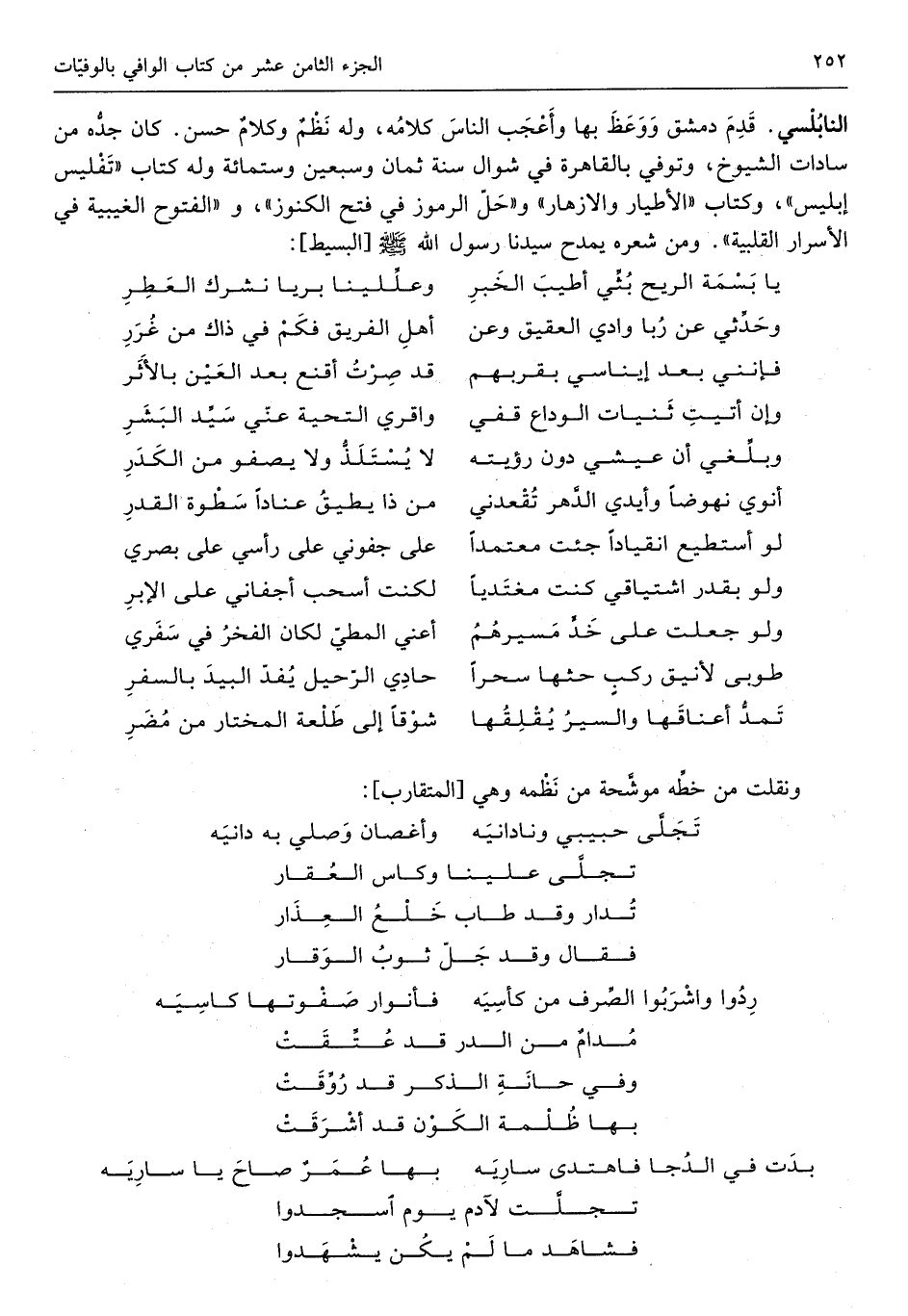 النابلسي قدم دمشق وَوعظ بهَا وأعجب النَّاس كَلَامه وَله نظم وَكَلَام حسن كَانَ جده من سَادَات الشُّيُوخ وَتُوفِّي بِالْقَاهِرَةِ فِي شَوَّال سنة ثَمَان وَسبعين وست مائَة وَله كتاب تفليس إِبْلِيس وَكتاب الأطيار والأزهار وَحل الرموز فِي فتح الْكُنُوز والفتوح الغيبية فِي الْأَسْرَار القلبية وَمن شعره يمدح سيدنَا رَسُول الله صلى الله عَلَيْهِ وَسلم الْبَسِيط