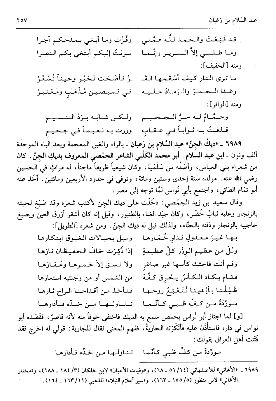 عبد السَّلَام بن رغبان بالراء والغين الْمُعْجَمَة وَبعد الْبَاء الْمُوَحدَة ألف وَنون ابْن عبد السَّلَام أَبُو مُحَمَّد الْكَلْبِيّ الشَّاعِر الْحِمصِي الْمَعْرُوف بديك الْجِنّ كَانَ من شعراء بني الْعَبَّاس وَأَصله من سلمية وَكَانَ شِيعِيًّا ظريفاً مَاجِنًا لَهُ مراث فِي الْحُسَيْن رَضِي الله عَنهُ مولده سنة إِحْدَى وَسِتِّينَ وَمِائَة وَتُوفِّي فِي حُدُود الْأَرْبَعين وَمِائَتَيْنِ أَخذ عَنهُ أَبُو تَمام الطَّائِي وَاجْتمعَ بِأبي نواس لما توجه إِلَى مصر