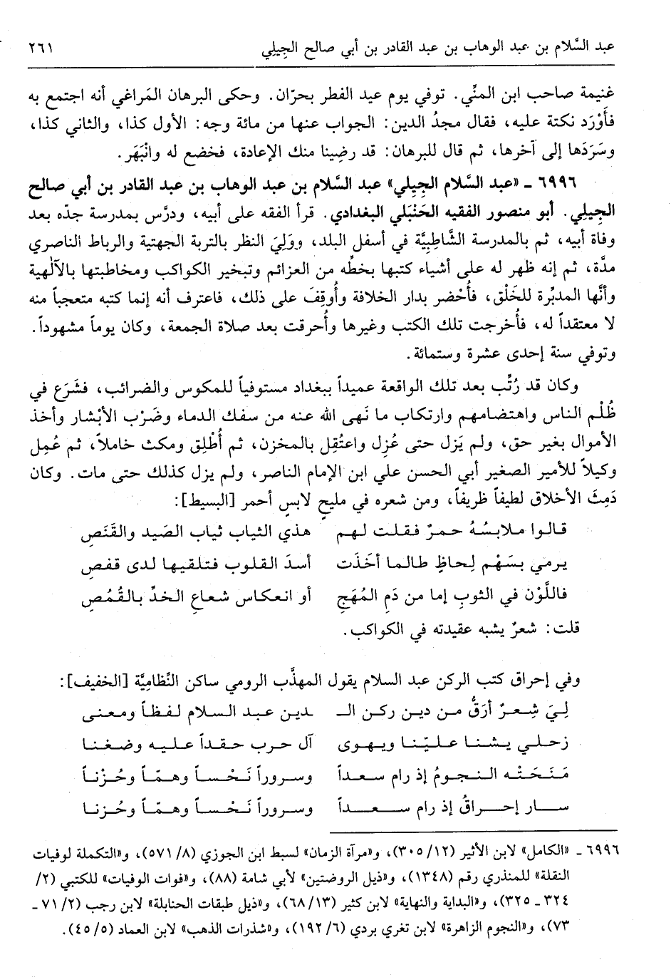 عبد السَّلَام بن عبد الْوَهَّاب بن عبد الْقَادِر بن أبي صَالح الجيلي أَبُو مَنْصُور الْفَقِيه الْحَنْبَلِيّ البغداذي قَرَأَ الْفِقْه على أَبِيه ودرس بمدرسة جده بعد وَفَاة أَبِيه ثمَّ بِالْمَدْرَسَةِ الشاطبية فِي أَسْفَل الْبَلَد وَولي النّظر بالتربة الجهتية والرباط الناصري مُدَّة ثمَّ إِنَّه ظهر لَهُ على أَشْيَاء كتبهَا بِخَطِّهِ من العزائم وتبخير الْكَوَاكِب ومخاطبتها بالإلهية وَأَنَّهَا الْمُدبرَة لِلْخلقِ فأحضر بدار الْخلَافَة وأوقف على ذَلِك فاعترف أَنه إِنَّمَا كتبه مُتَعَجِّبا مِنْهُ لَا مُعْتَقدًا لَهُ فأخرجت تِلْكَ الْكتب وَغَيرهَا وأحرقت بعد صَلَاة الْجُمُعَة وَكَانَ يَوْمًا مشهوداً وَتُوفِّي سنة إِحْدَى عشرَة وست مائَة