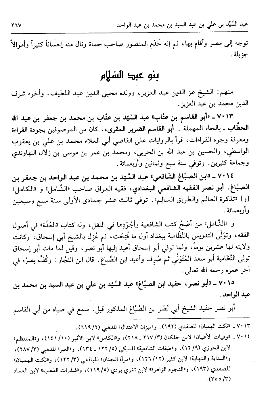 عبد السَّيِّد بن مُحَمَّد بن عبد الْوَاحِد بن جَعْفَر بن الصّباغ أَبُو نصر الْفَقِيه الشَّافِعِي البغداذي فَقِيه الْعرَاق صَاحب الشَّامِل والكامل وَتَذْكِرَة الْعَالم وَالطَّرِيق السَّالِم توفّي ثَالِث عشر جُمَادَى الأولى سنة سبع وَسبعين وَأَرْبع مائَة