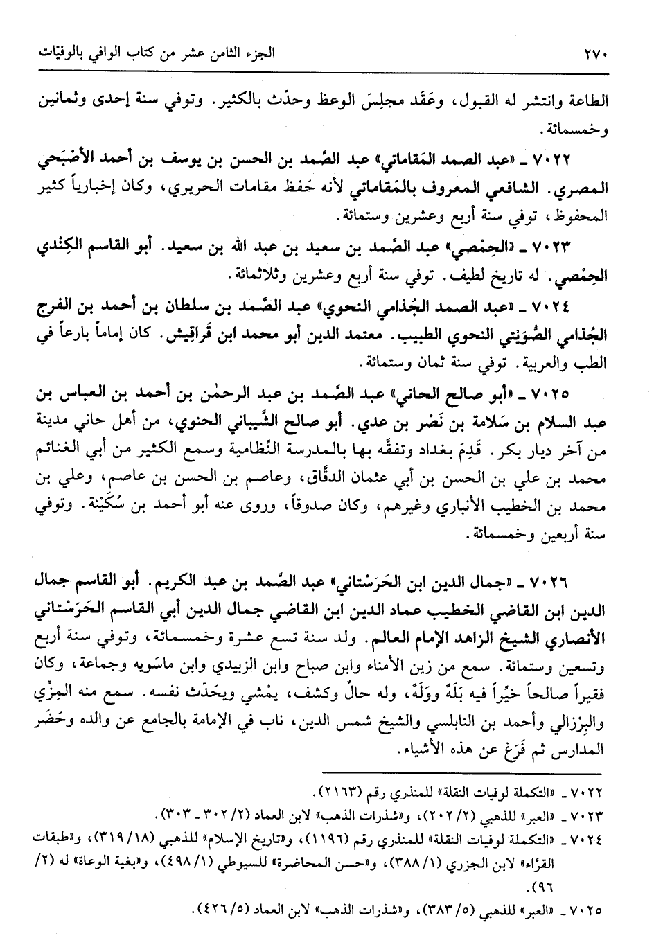 عبد الصَّمد بن عبد الْكَرِيم أَبُو الْقَاسِم جمال الدّين ابْن القَاضِي الْخَطِيب عماد الدّين ابْن القَاضِي جمال الدّين أبي الْقَاسِم الحرستاني الْأنْصَارِيّ الشَّيْخ الزَّاهِد الإِمَام الْعَالم ولد سنة تسع عشرَة وَخمْس مائَة وَتُوفِّي سنة أَربع وَتِسْعين وست مائَة سمع من زين الْأُمَنَاء وَابْن صباح وَابْن الزبيدِيّ وَابْن ماسويه وَجَمَاعَة وَكَانَ فَقِيرا صَالحا خيرا فِيهِ بلة وَوَلِهَ وَله حَال وكشف يمشي وَيحدث نَفسه سمع مِنْهُ الْمزي والبرزالي وَأحمد بن النابلسي وَالشَّيْخ شمس الدّين نَاب فِي الْإِمَامَة بالجامع عَن وَالِده وَحضر الْمدَارِس ثمَّ فرغ عَن هَذِه الْأَشْيَاء