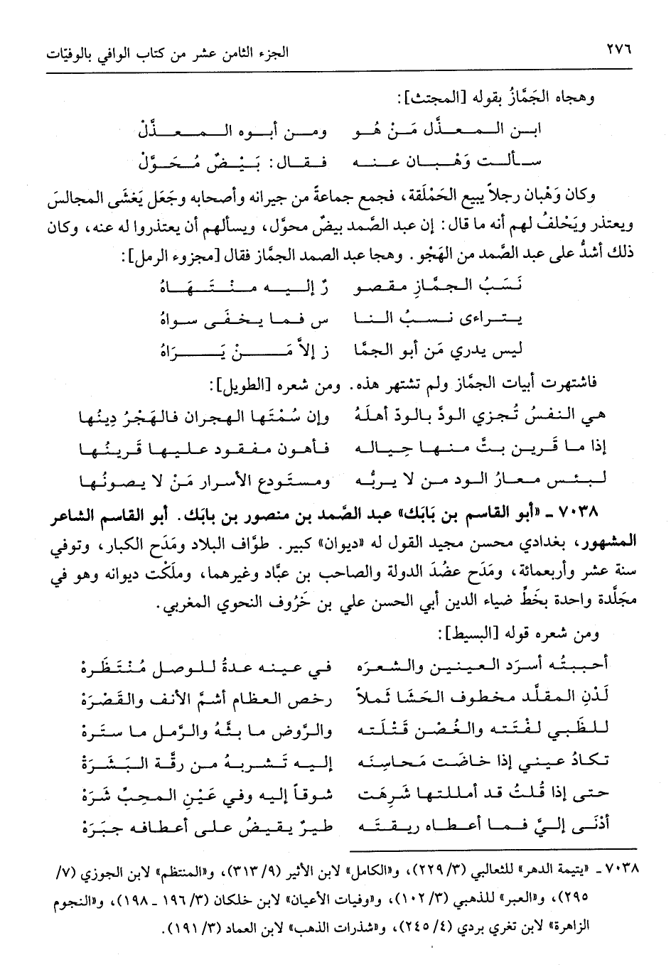 وَكَانَ وهبان رجلا يَبِيع الحملقة فَجمع جمَاعَة من جِيرَانه وَأَصْحَابه وَجعل يغشى الْمجَالِس وَيعْتَذر وَيحلف لَهُم أَنه مَا قَالَ إِن عبد الصَّمد بيض محول ويسألهم أَن يعتذروا لَهُ عَنهُ وَكَانَ ذَلِك أَشد على عبد الصَّمد من الهجو وهجا عبد الصَّمد الجماز فَقَالَ مجزوء الرمل نسب الجماز مَقْصُور إِلَيْهِ منتهاه يتَرَاءَى نسب النَّاس فَمَا يخفى سواهُ لَيْسَ يدْرِي من أَبُو الجماز إِلَّا من يرَاهُ فاشتهرت أَبْيَات الجماز وَلم تشتهر هَذِه وَمن شعره الطَّوِيل)