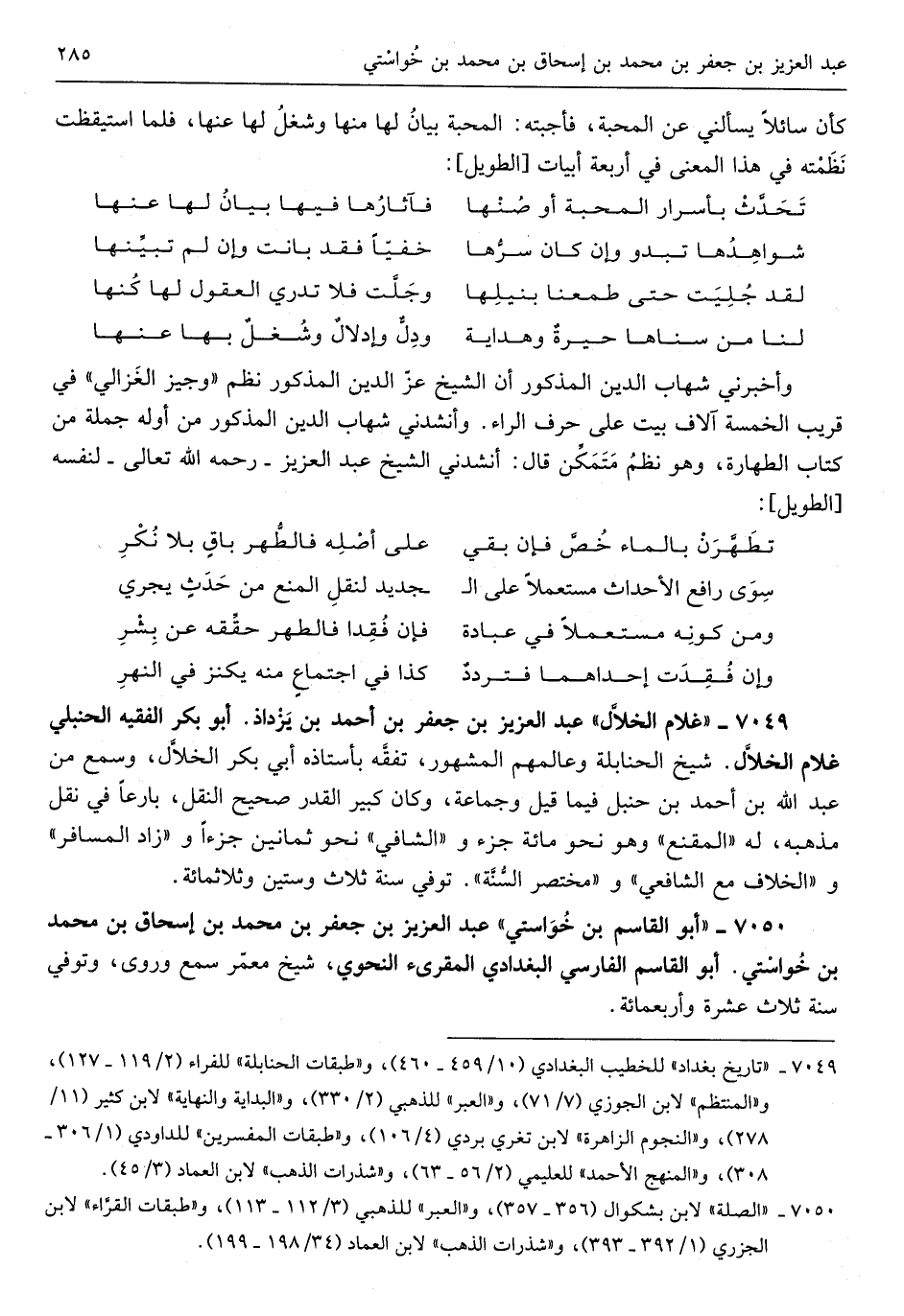 عبد الْعَزِيز بن جَعْفَر بن أَحْمد بن يزداذ أَبُو بكر الْفَقِيه الْحَنْبَلِيّ غُلَام الْخلال شيخ الْحَنَابِلَة وعالمهم الْمَشْهُور تفقه بأستاذه أبي بكر الْخلال وَسمع من عبد الله بن أَحْمد بن حَنْبَل فِيمَا قيل وَجَمَاعَة وَكَانَ كَبِير الْقدر صَحِيح النَّقْل بارعاً فِي نقل مذْهبه لَهُ الْمقنع وَهُوَ نَحْو مائَة جُزْء والشافي نَحْو ثَمَانِينَ جُزْءا وَزَاد الْمُسَافِر وَالْخلاف مَعَ الشَّافِعِي ومختصر السّنة توفّي سنة ثَلَاث وَسِتِّينَ وَثَلَاث مائَة