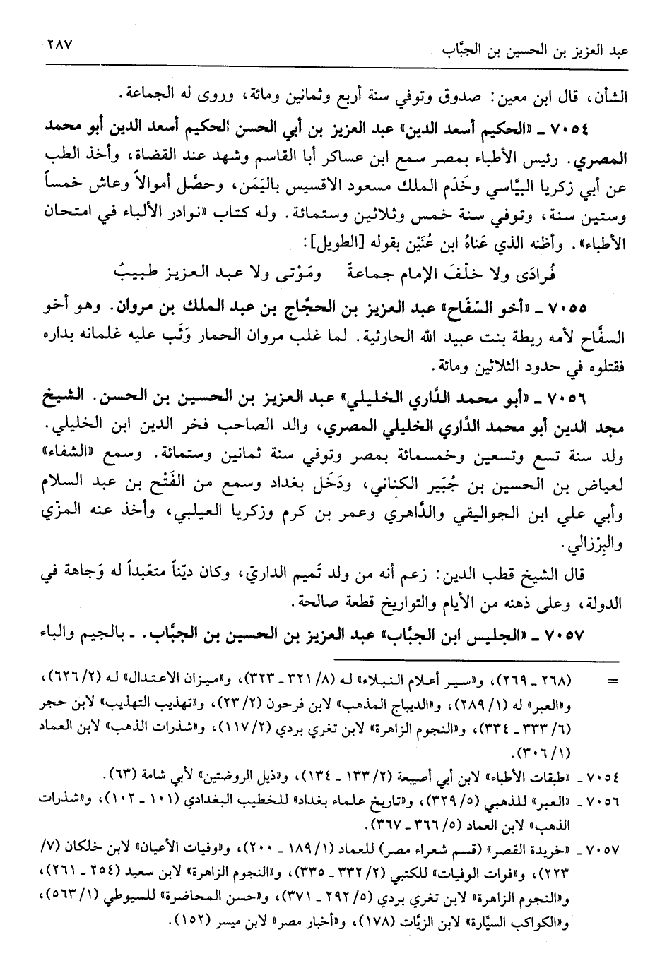 عبد الْعَزِيز بن أبي الْحسن الْحَكِيم أسعد الدّين أَبُو مُحَمَّد الْمصْرِيّ رَئِيس الْأَطِبَّاء بِمصْر سمع ابْن عَسَاكِر أَبَا الْقَاسِم وَشهد عِنْد الْقُضَاة وَأخذ الطِّبّ عَن أبي زَكَرِيَّا البياسي وخدم الْملك مَسْعُود الاقسيس بِالْيمن وَحصل أَمْوَالًا وعاش خمْسا وَسِتِّينَ سنة وَتُوفِّي سنة خمس وَثَلَاثِينَ وست مائَة وَله كتاب نَوَادِر الألباء فِي امتحان الْأَطِبَّاء وَأَظنهُ الَّذِي عناه ابْن عنين بقوله)