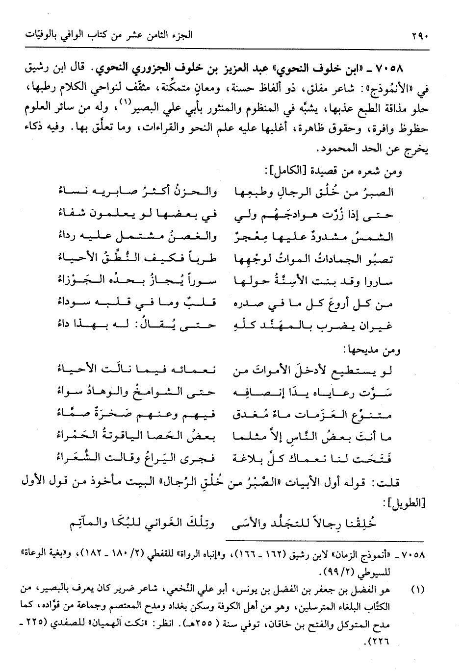 عبد الْعَزِيز بن خلوف الجزوري النَّحْوِيّ قَالَ ابْن رَشِيق فِي الأنموذج شَاعِر مفلق ذُو أَلْفَاظ حَسَنَة وَمَعَان متمكنة مثقف لنواحي الْكَلَام رطبها حُلْو مذاقة الطَّبْع عذبها يشبه فِي المنظوم والمنثور بِأبي عَليّ الْبَصِير وَله من سَائِر الْعُلُوم حظوظ وافرة وَحُقُوق ظهرة أغلبها عَلَيْهِ علم النَّحْو والقراءات وَمَا تعلق بهَا وَفِيه ذكاء يخرج عَن الْحَد الْمَحْمُود
