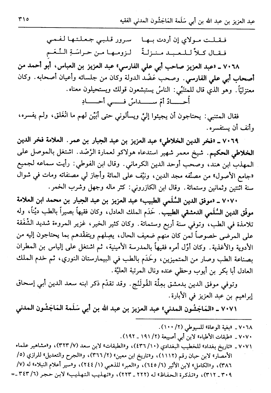 عبد الْعَزِيز بن عبد الْجَبَّار بن مُحَمَّد ابْن الْعَلامَة موفق الدّين السّلمِيّ الدِّمَشْقِي الطَّبِيب خدم الْملك الْعَادِل وَكَانَ فَقِيها بَصيرًا بالطب دينا وَله تلامذة فِي الطِّبّ وَتُوفِّي سنة أرع وست مائَة وَكَانَ كثير الْخَيْر غزير الْمُرُوءَة شَدِيد الشَّفَقَة على الْمَرَض خُصُوصا لمن كَانَ مِنْهُم ضَعِيف الْحَال يصلهم ويتفقدهم بِمَا يَحْتَاجُونَ إِلَيْهِ من الْأَدْوِيَة والأغذية وَكَانَ أول أمره فَقِيها بِالْمَدْرَسَةِ الأمينية ثمَّ اشْتغل على إلْيَاس بن المطران بصناعة الطِّبّ وَصَارَ من المتميزين)