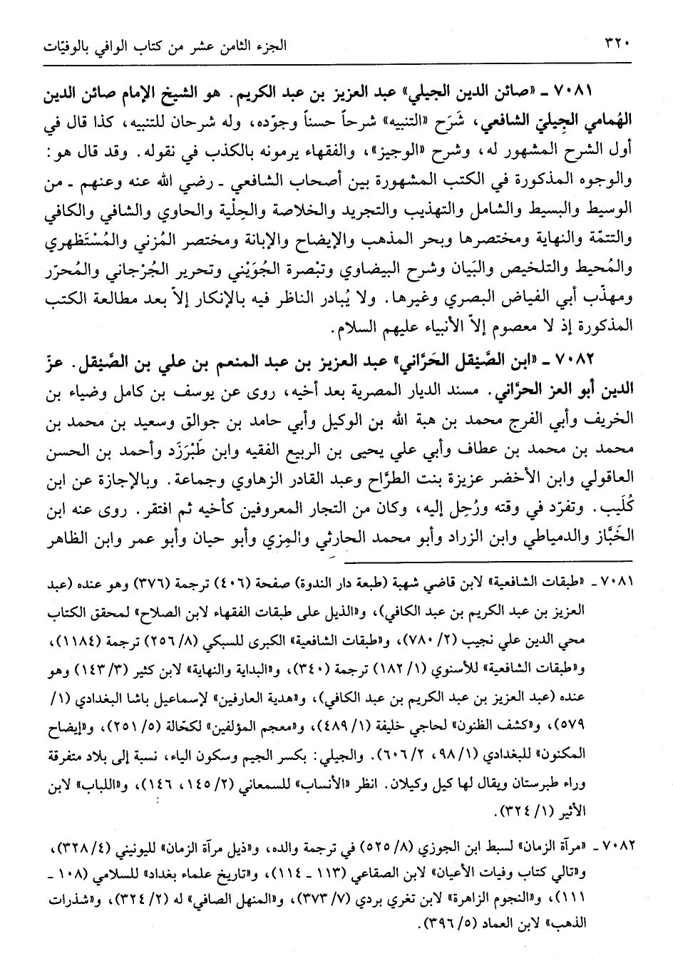عبد الْعَزِيز بن عبد الْكَرِيم هُوَ الشَّيْخ الإِمَام صائن الدّين الهمامي الجيلي الشَّافِعِي شرح التَّنْبِيه شرحاً حسنا وجوده وَله شرحان للتّنْبِيه كَذَا قَالَ فِي أول الشَّرْح الْمَشْهُور لَهُ وَشرح الْوَجِيز وَالْفُقَهَاء يرمونه بِالْكَذِبِ فِي نقُوله وَقد قَالَ هُوَ وَالْوُجُوه الْمَذْكُورَة فِي الْكتب الْمَشْهُورَة بَين أَصْحَاب الشَّافِعِي رَضِي الله عَنهُ وعنهم من الْوَسِيط والبسيط والشامل والتهذيب والتجريد وَالْخُلَاصَة والحلية وَالْحَاوِي والشافي وَالْكَافِي والتتمة وَالنِّهَايَة ومختصرها وبحر الْمَذْهَب والإيضاح والإبانة ومختصر الْمُزنِيّ والمستظهري وَالْمُحِيط وَالتَّلْخِيص وَالْبَيَان وَشرح الْبَيْضَاوِيّ وتبصرة الْجُوَيْنِيّ وتحرير الْجِرْجَانِيّ وَالْمُحَرر ومهذب أبي الْفَيَّاض الْبَصْرِيّ وَغَيرهَا وَلَا يُبَادر النَّاظر فِيهِ بالإنكار لَا بعد مطالعة الْكتب الْمَذْكُورَة إِذْ لَا مَعْصُوم إِلَّا الْأَنْبِيَاء عَلَيْهِم السَّلَام