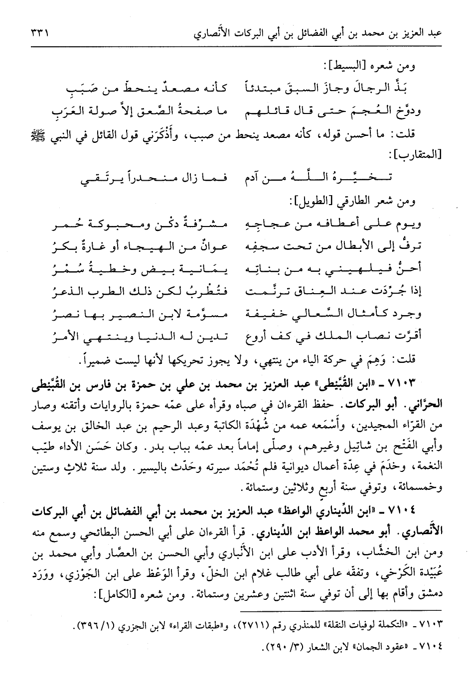 عبد الْعَزِيز بن مُحَمَّد بن أبي الْفَضَائِل بن أبي البركات الْأنْصَارِيّ أَبُو مُحَمَّد الْوَاعِظ ابْن الديناري قَرَأَ الْقُرْآن على أبي الْحسن البطائحي وَسمع مِنْهُ وَمن ابْن الخشاب وَقَرَأَ الْأَدَب على ابْن الْأَنْبَارِي وَأبي الْحسن بن العصار وَأبي مُحَمَّد بن عُبَيْدَة الْكَرْخِي وتفقه على أبي طَالب غُلَام ابْن الْخلّ وَقَرَأَ الْوَعْظ على ابْن الْجَوْزِيّ وَورد دمشق وَأقَام بهَا إِلَى أَن توفّي سنة اثْنَتَيْنِ وَعشْرين وست مائَة وَمن شعره الْكَامِل