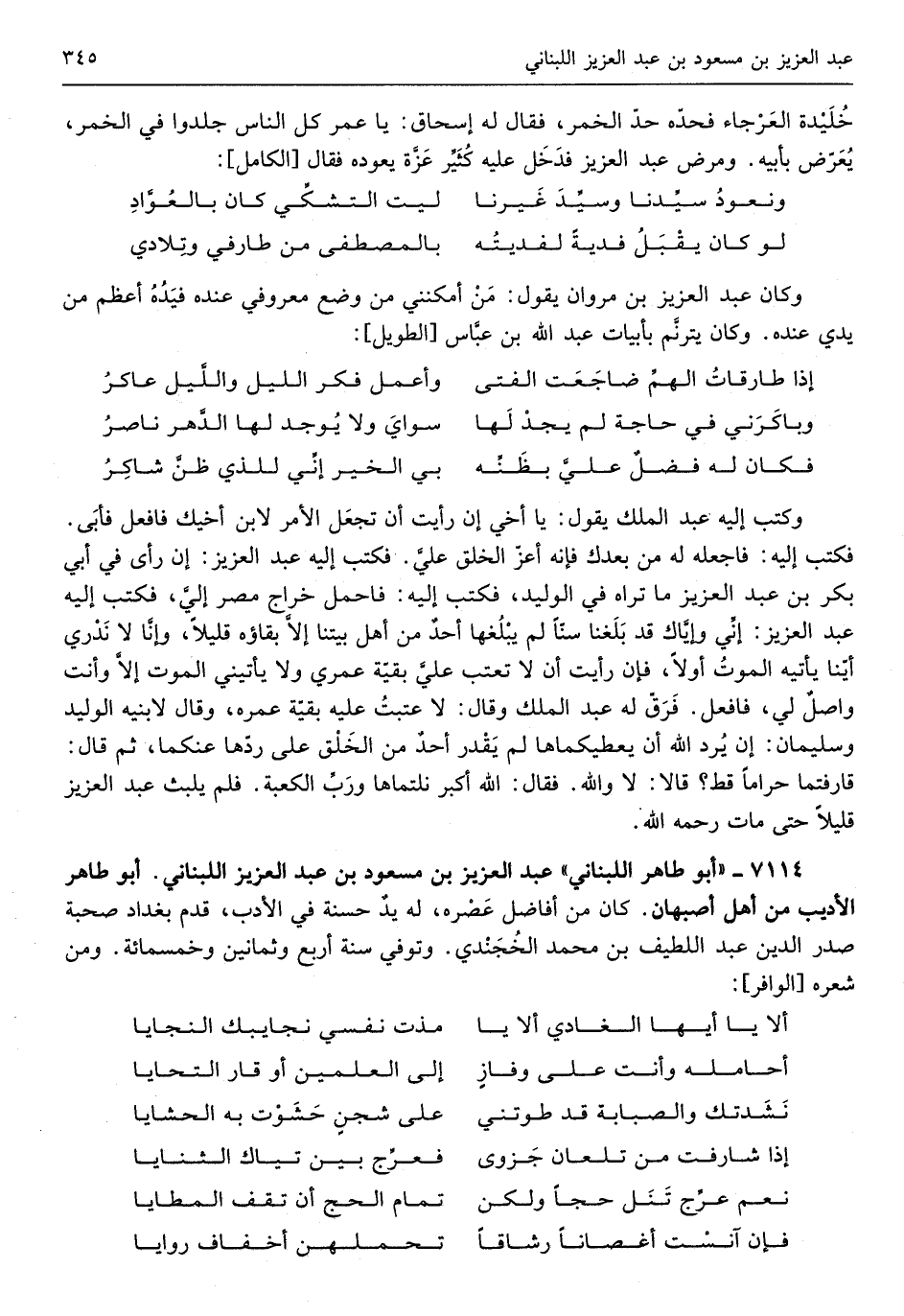 عبد الْعَزِيز بن مَسْعُود بن عبد الْعَزِيز اللبناني أَبُو طَاهِر الأديب من أهل أَصْبَهَان كَانَ من أفاضل عصره لَهُ يَد حَسَنَة فِي الْأَدَب قدم بغداذ صُحْبَة صدر الدّين عبد اللَّطِيف بن مُحَمَّد الخجندي وَتُوفِّي سنة أَربع وَثَمَانِينَ وَخمْس مائَة وَمن شعره الوافر
