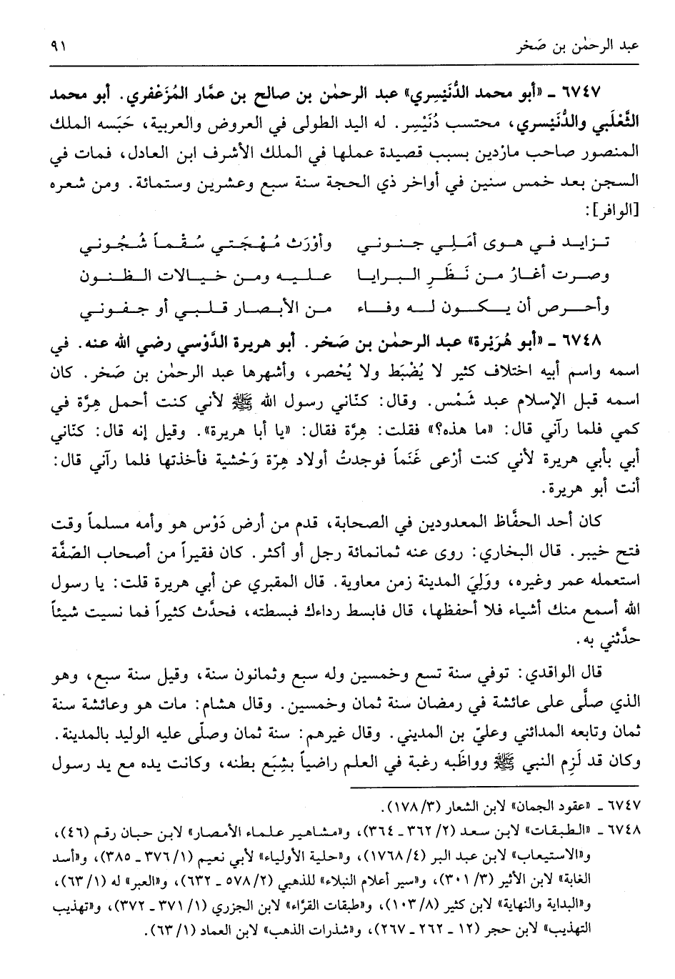 عبد الرَّحْمَن بن صَخْر أَبُو هُرَيْرَة الدوسي رَضِي الله عَنهُ فِي اسْمه وَاسم أَبِيه اخْتِلَاف كثير لَا يضْبط وَلَا يحصر وأشهرها عبد الرَّحْمَن بن صَخْر كَانَ اسْمه قبل الْإِسْلَام عبد شمس