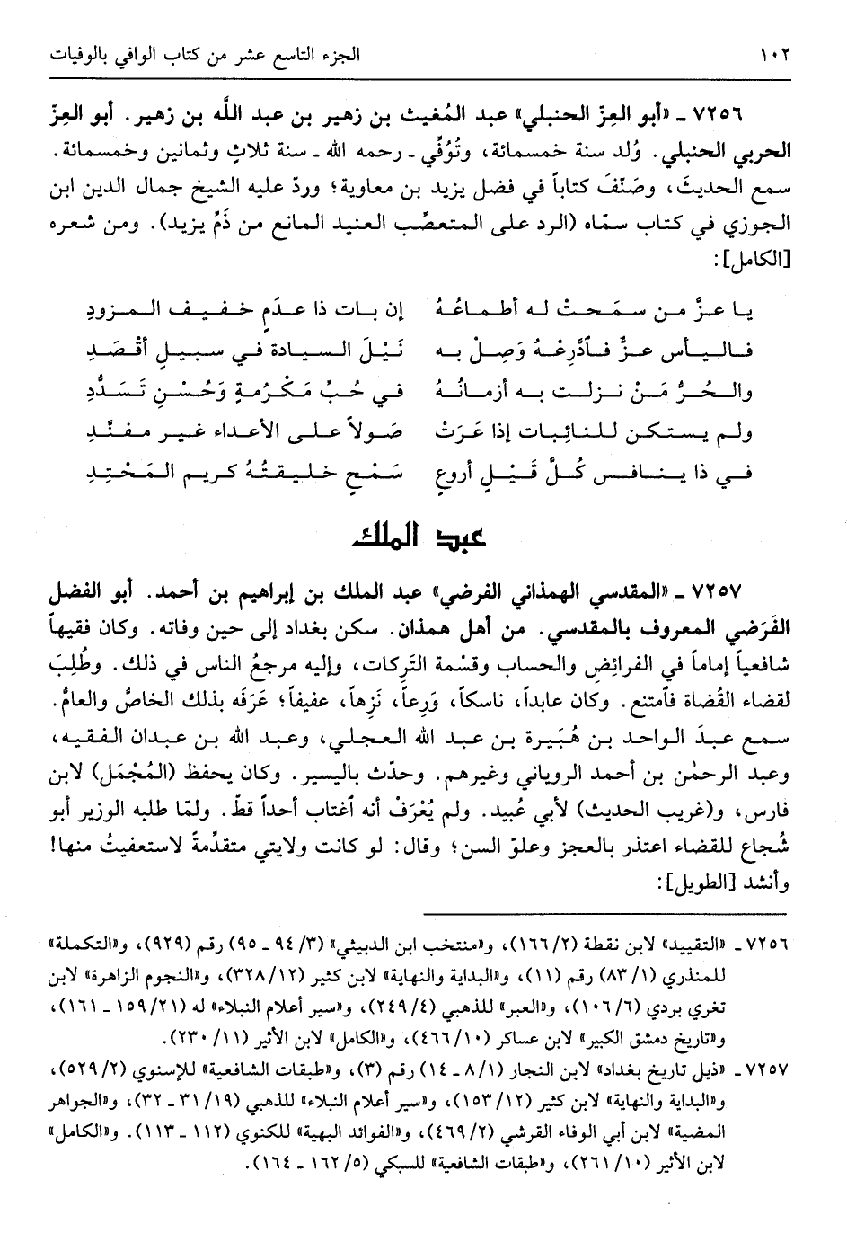 عبد المغيث بن زُهَيْر بن عبد الله بن زُهَيْر أَبُو الْعِزّ الْحَرْبِيّ الْحَنْبَلِيّ ولد سنة خمس ماية وَتُوفِّي رَحمَه الله سنة ثَلَاث وَثَمَانِينَ وَخمْس ماية سمع الحَدِيث وصنف كتابا فِي فضل يزِيد بن مُعَاوِيَة ورد على الشَّيْخ جمال الدّين ابْن الْجَوْزِيّ فِي كتاب سَمَّاهُ الرَّد على المتعصب العنيد الْمَانِع من ذمّ يزِيد وَمن شعره