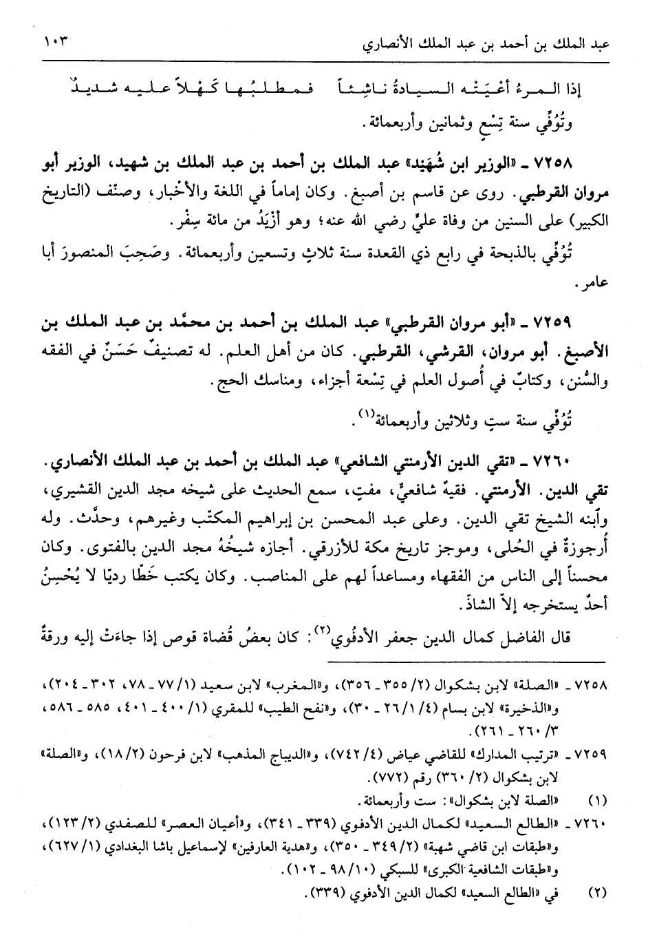 عبد الْملك بن أَحْمد بن عبد الْملك بن شَهِيد الْوَزير أَبُو مَرْوَان الْقُرْطُبِيّ روى عَن قَاسم بن أصبغ وَكَانَ إِمَامًا فِي اللُّغَة وَالْأَخْبَار وصنف التَّارِيخ الْكَبِير على السنين من وَفَاة عَليّ رَضِي الله عَنهُ وَهُوَ أَزِيد من مائَة سفر