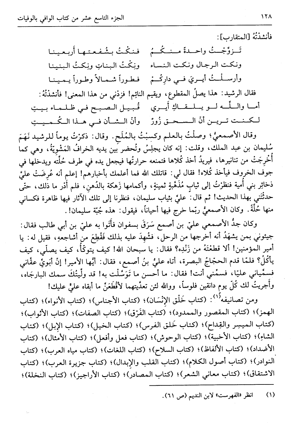 وَقَالَ الْأَصْمَعِي وصلت بِالْعلمِ وكسبت بالملح وَقَالَ ذكرت يَوْمًا للرشيد نهم سُلَيْمَان بن عبد الْملك وَقلت إِنَّه كَانَ يجلس وتحضر بَين يَدَيْهِ الخراف المشوية وَهِي كَمَا أخرجت من تنانيرها فيريد أَخذ كلاها فتمنعه حَرَارَتهَا فَيجْعَل يَده فِي طرف حلته ويدخلها فِي جَوف الخروف فَيَأْخُذ كلاه فَقَالَ لي قَاتلك الله فَمَا أعلمك بأخبارهم إعلم أَنه عرضت عَليّ ذخائر بني أُميَّة فَنَظَرت إِلَى ثِيَاب مذهبَة ثمينة وأكمامها زهكة بالدهن فَلم أدر مَا ذَلِك حَتَّى حَدَّثتنِي)