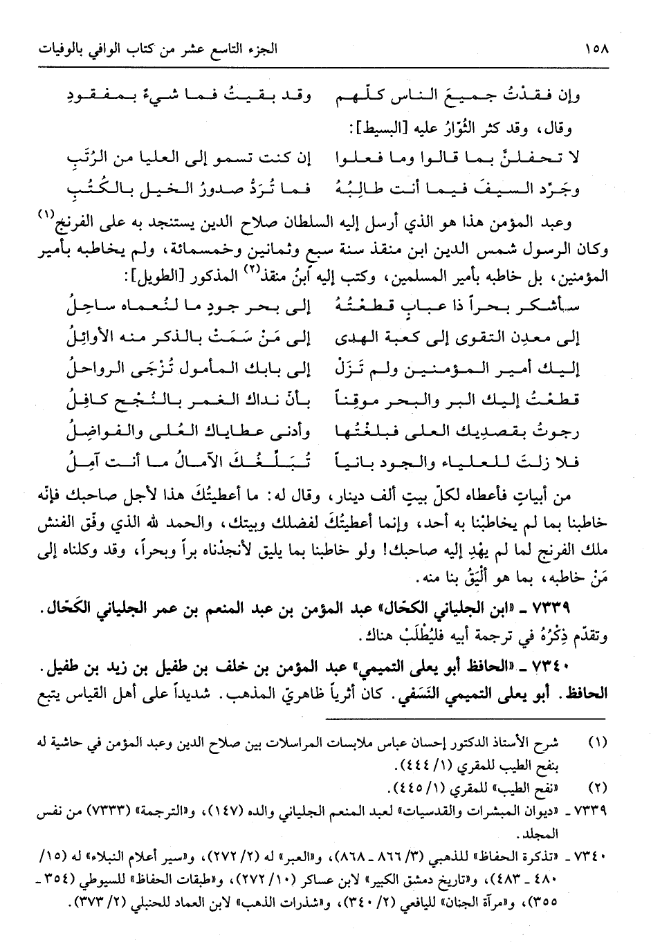 من أَبْيَات فَأعْطَاهُ لكل بَيت ألف دِينَار وَقَالَ لَهُ مَا أَعطيتك هَذَا لأجل صَاحبك فَإِنَّهُ خاطبنا بِمَا لم يخاطبنا بِهِ أحد وَإِنَّمَا أَعطيتك لفضلك وبيتك وَالْحَمْد لله الَّذِي وفْق الفنش ملك الفرنج لما لم يهد إِلَيْهِ صَاحبك وَلَو خاطبنا بِمَا يَلِيق لأنجدناه برا وبحراً وَقد وكلناه إِلَى من خاطبه بِمَا هُوَ أليق بِنَا مِنْهُ