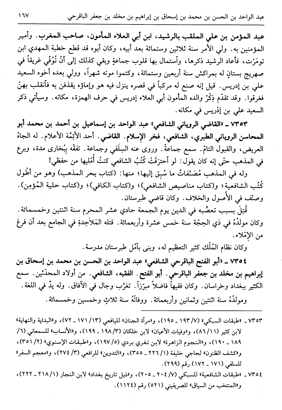 عبد الْوَاحِد بن إِسْمَاعِيل بن أَحْمد بن مُحَمَّد أَبُو المحاسن الرَّوْيَانِيّ الطَّبَرِيّ الشَّافِعِي فَخر الْإِسْلَام القَاضِي أحد الْأَئِمَّة الْأَعْلَام لَهُ الجاه العريض وَالْقَبُول التَّام سمع جمَاعَة وروى عَنهُ السلَفِي وَجَمَاعَة تفقه ببخارى مُدَّة وبرع فِي الْمَذْهَب حَتَّى أَنه كَانَ يَقُول لَو احترقت كتب الشَّافِعِي كنت أميلها من حفظي وَله فِي الْمَذْهَب مصنفات مَا سبق إِلَيْهَا مِنْهَا كتاب بَحر الْمَذْهَب وَهُوَ من أطول كتب الشَّافِعِيَّة وَكتاب مناصيص الشَّافِعِي وَكتاب الْكَافِي وَكتاب حلية الْمُؤمن وصنف فِي الْأُصُول وَالْخلاف وَكَانَ قَاضِي طبرستان